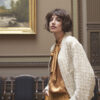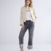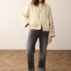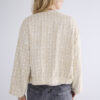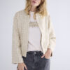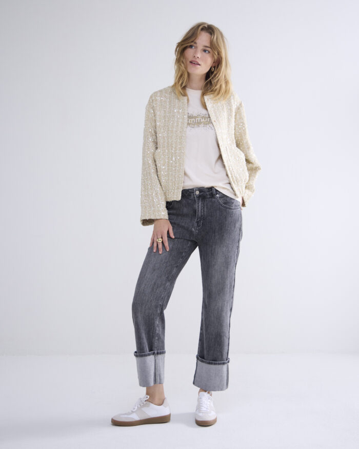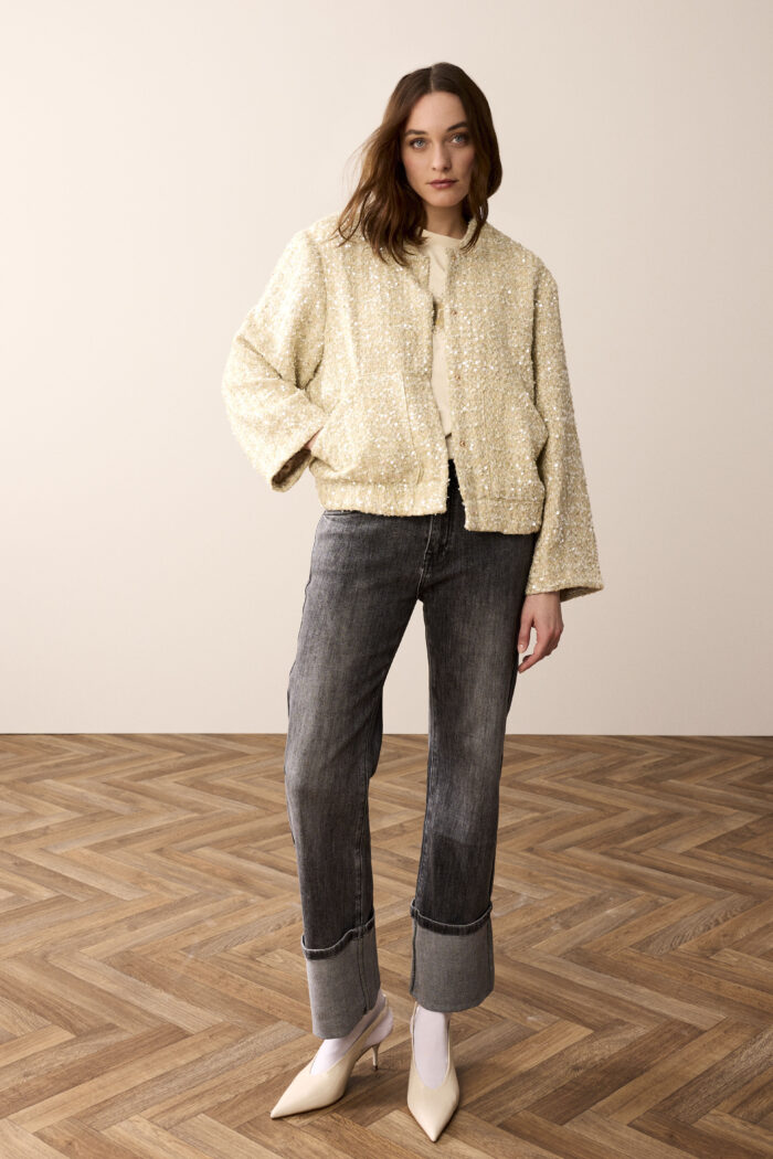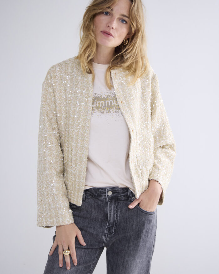 Short jacket with elastic hem, long wide sleeves and stand-up round collar. Press stud closure and large patch pockets. This jacket is made of shiny gold color yarn with sequin woven fabricPRODUCT