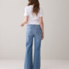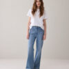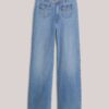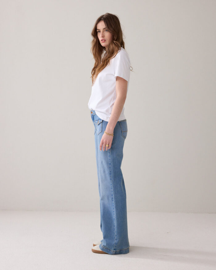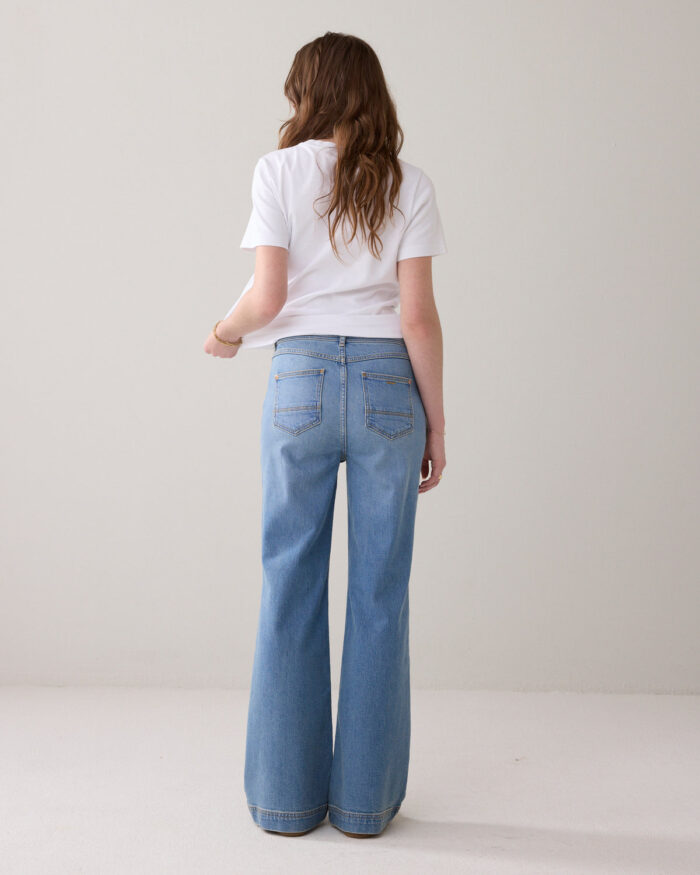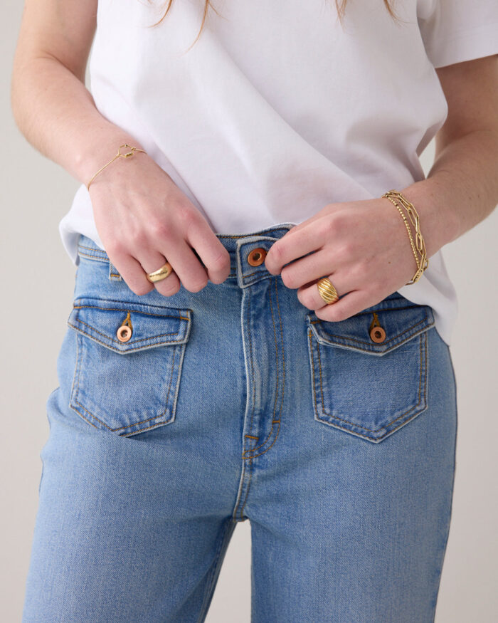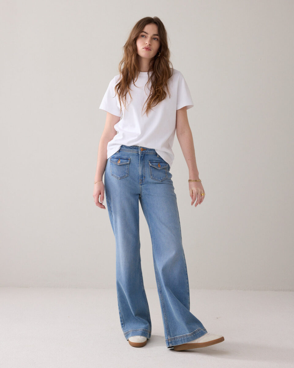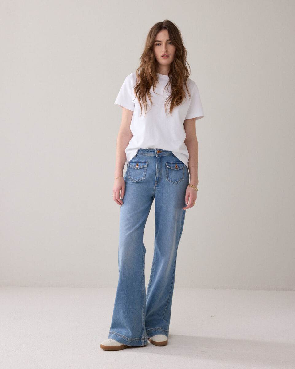 70s flared jeans with a light stonewash and patch flap pockets on the front. The jeans have a mid/high-rise waist, are fitted at the hip and flared downwards.