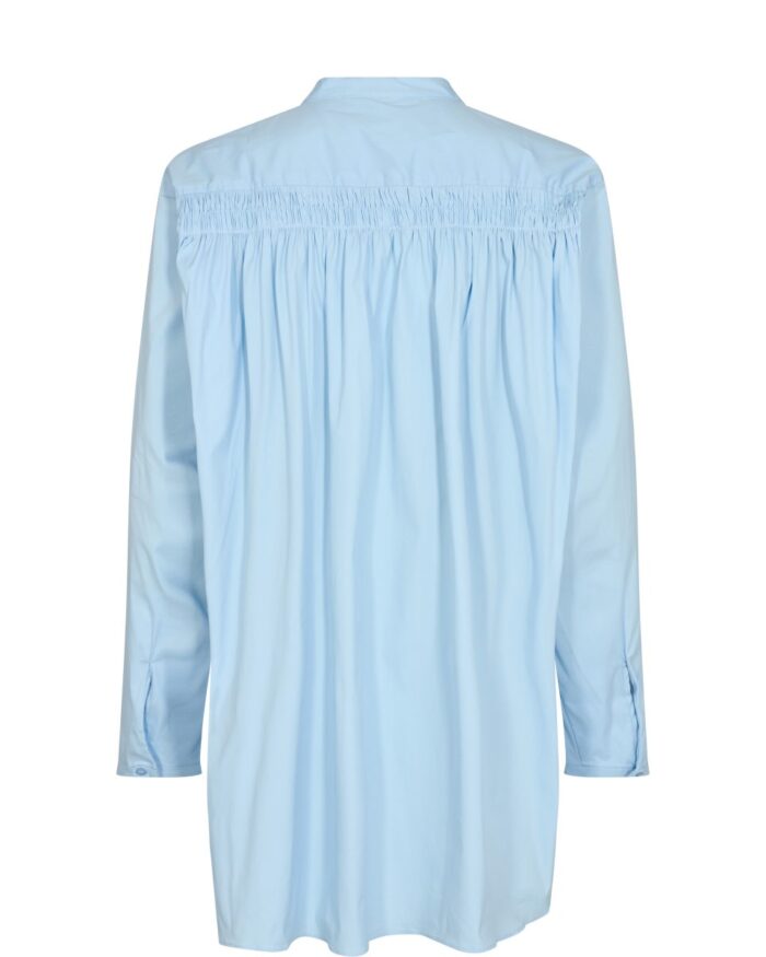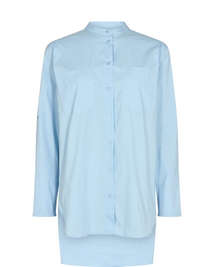 Classic shirt with a modern take in a relaxed fit. This shirt has a cool mandarin collar, classic button closure, front pockets, and wrinkle details with pleats at back. The sleeves hit just above the elbow. Style it with a pair of jeans and sandals.