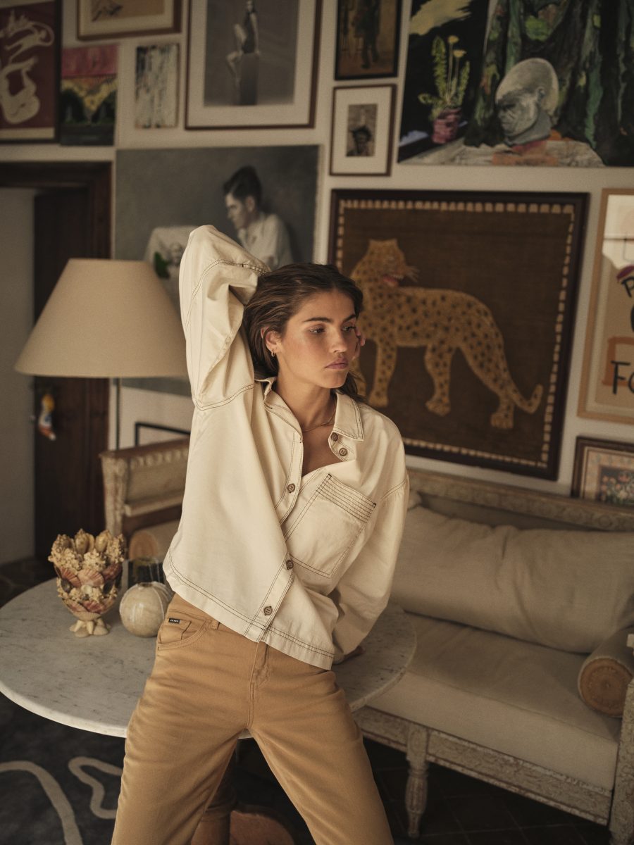These chic pants are perfect for spring! They are designed in a twill structure and cut in a flare fit with a high waist. The skinny fit at the top kicks out to a flare at the raw unfinished hem. We would style them with a classic shirt or a cool statement tee.