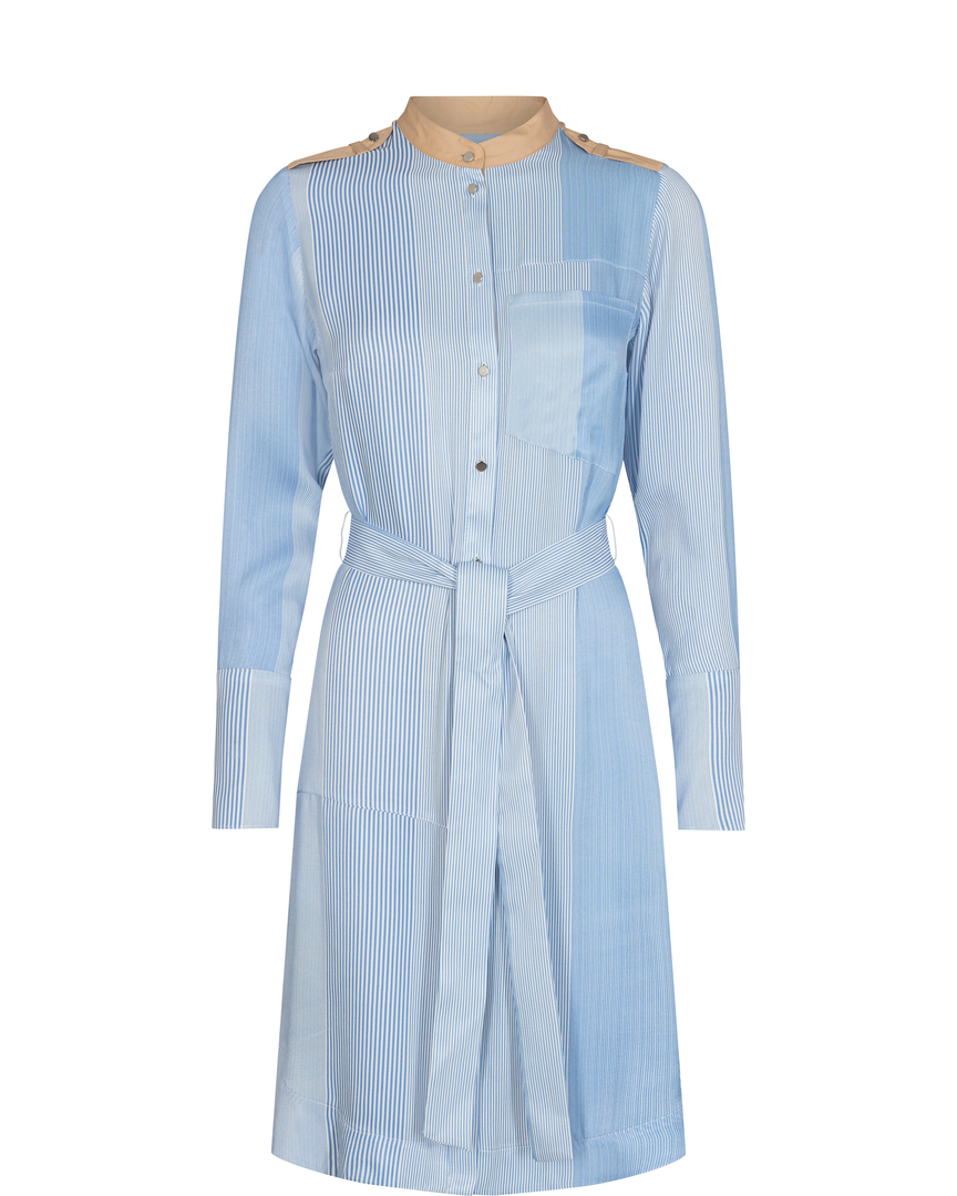 Colour blocking is one of this season’s coolest trends. We absolutely love this shirt dress, cut in a relaxed shape in stunning striped colour blocks. It has button closure, contrast coloured mandarin collar and shoulder straps. Wear it with or without the matching belt and pair it with suede flats.
