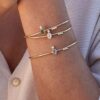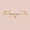 Ce jonc est fabriqué à la main en laiton doré à l’or fin 18K et serti d’une pierre de lune et d’un zircon blanc. Jonc ouvert à l’avant. Taille ajustable.