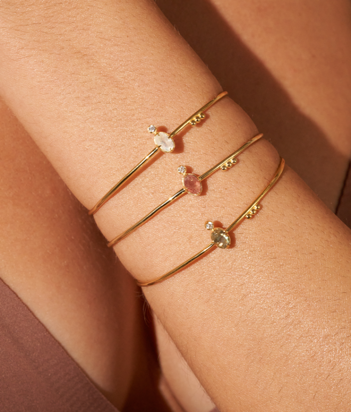 Tous nos bijoux sont en laiton doré à l’or fin 18K, fabriqués à la main dans nos ateliers. Nous utilisons des pierres naturelles semi-précieuses uniques, sourcées et travaillées directement sur place. Parce qu’un bijou du quotidien, c’est un bijou fait avec soin, nous allions un savoir-faire ancestral et des technologies de pointe pour réaliser des bijoux de qualité, hautement féminins.