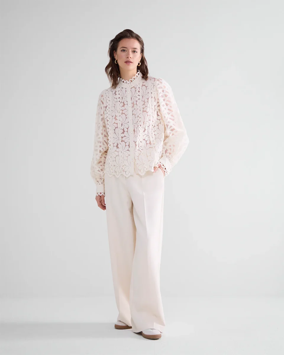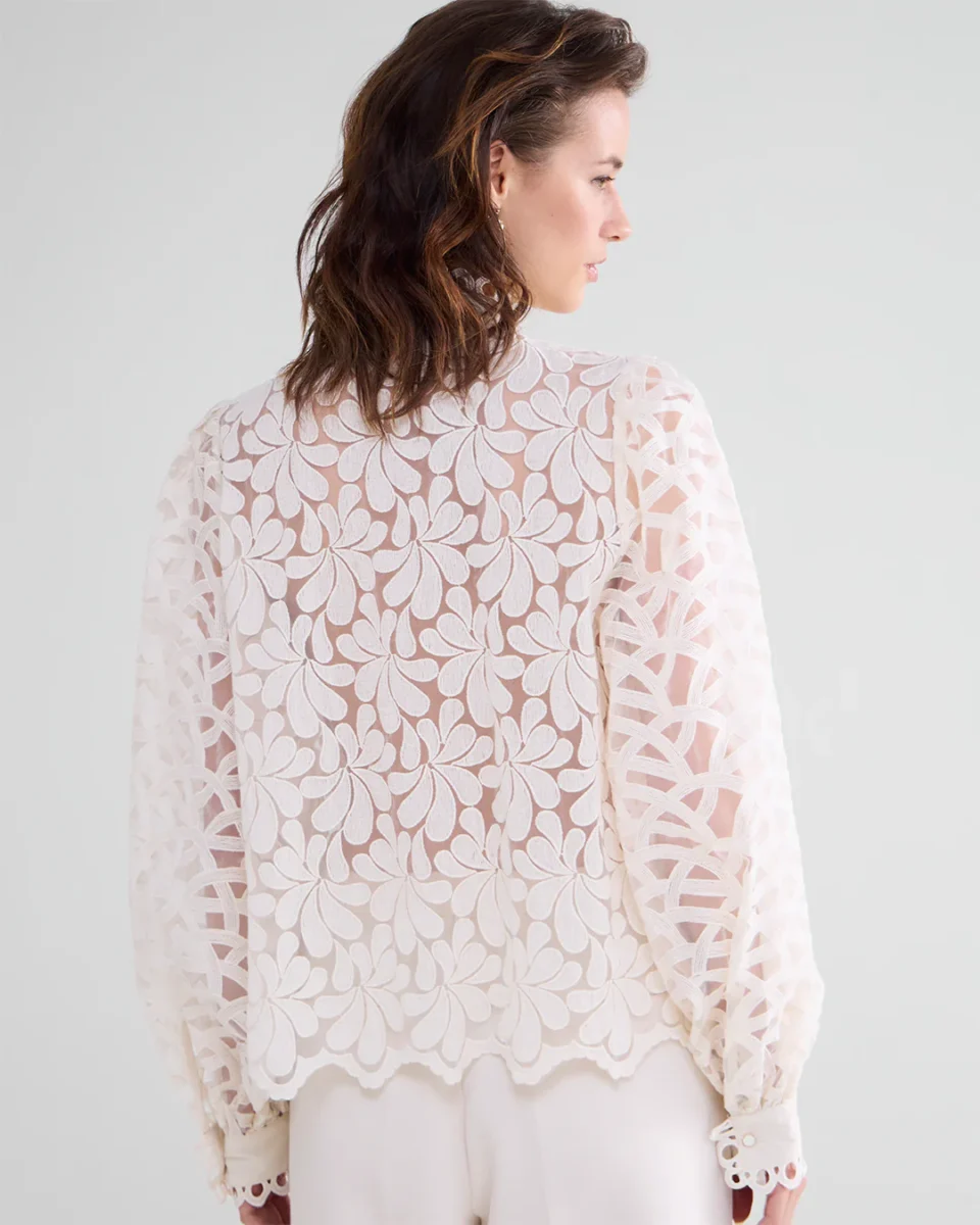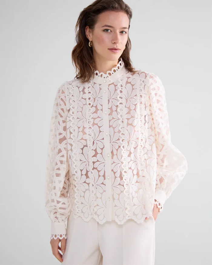 Translucent long blouse made of woven lace. The blouse has long balloon sleeves, a standing collar and is decorated with lace band with metal button closure.