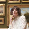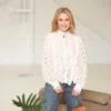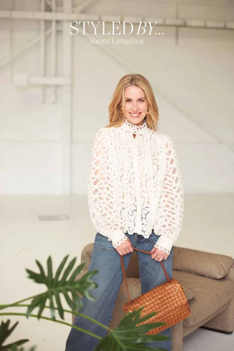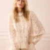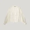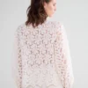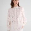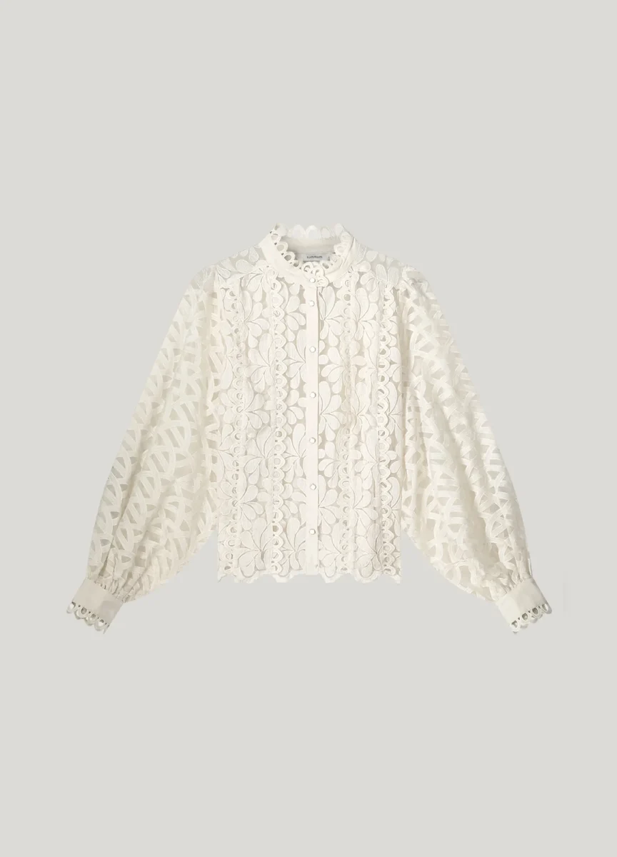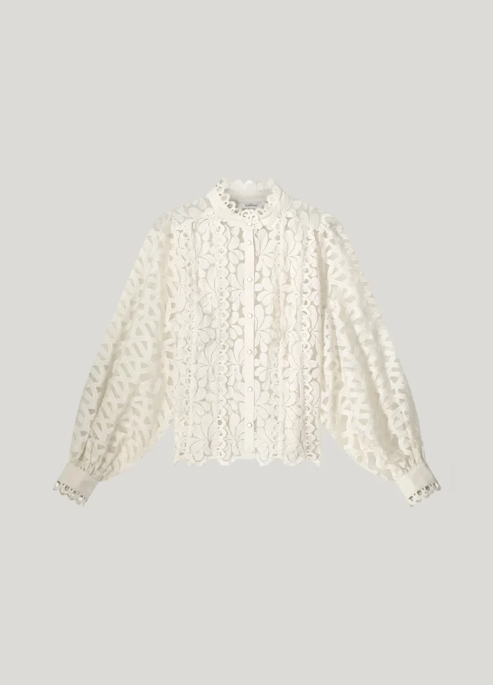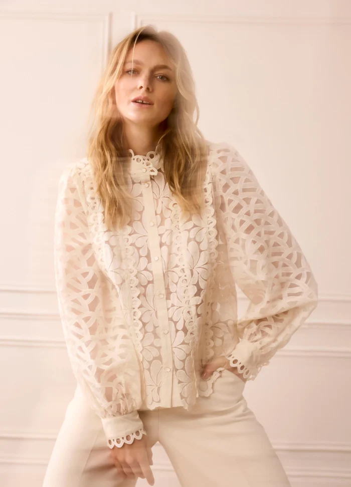 Translucent long blouse made of woven lace. The blouse has long balloon sleeves, a standing collar and is decorated with lace band with metal button closure.