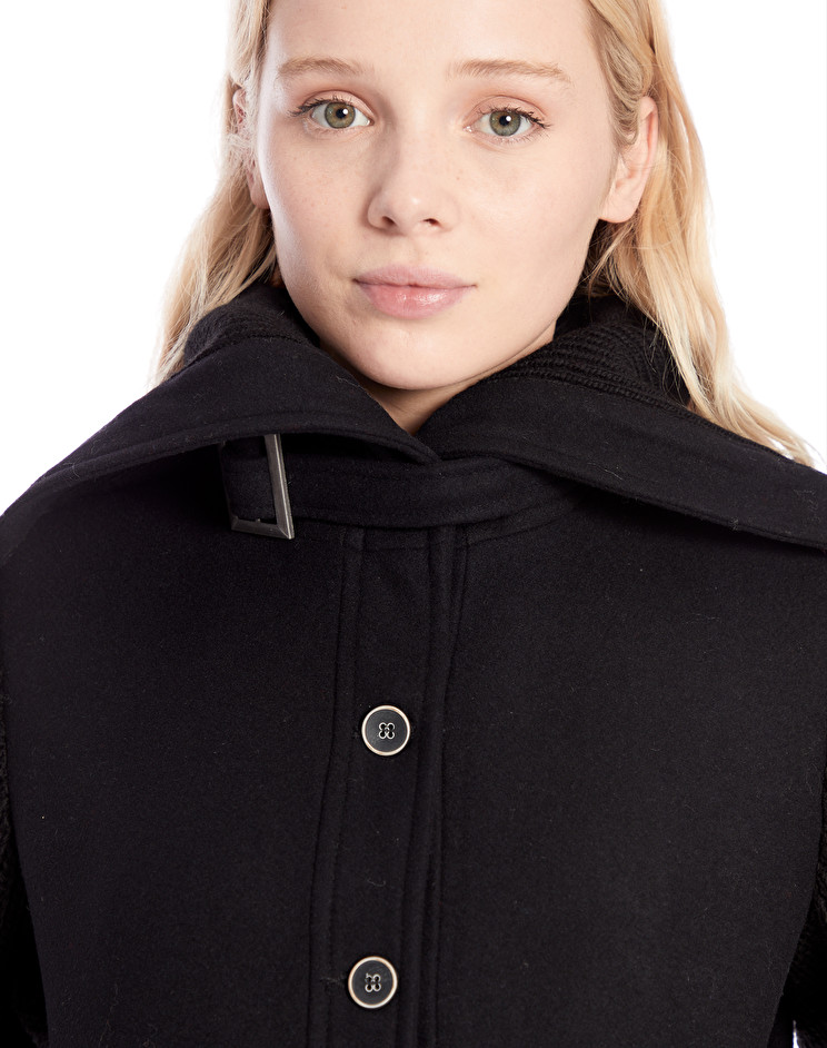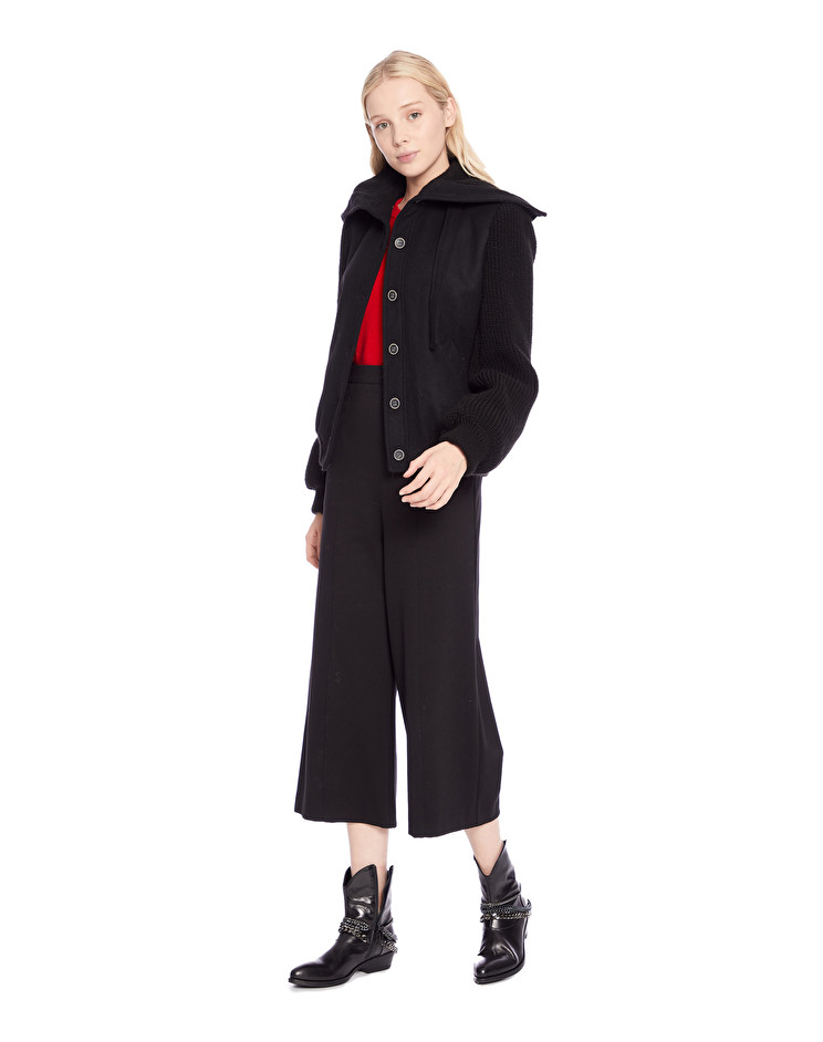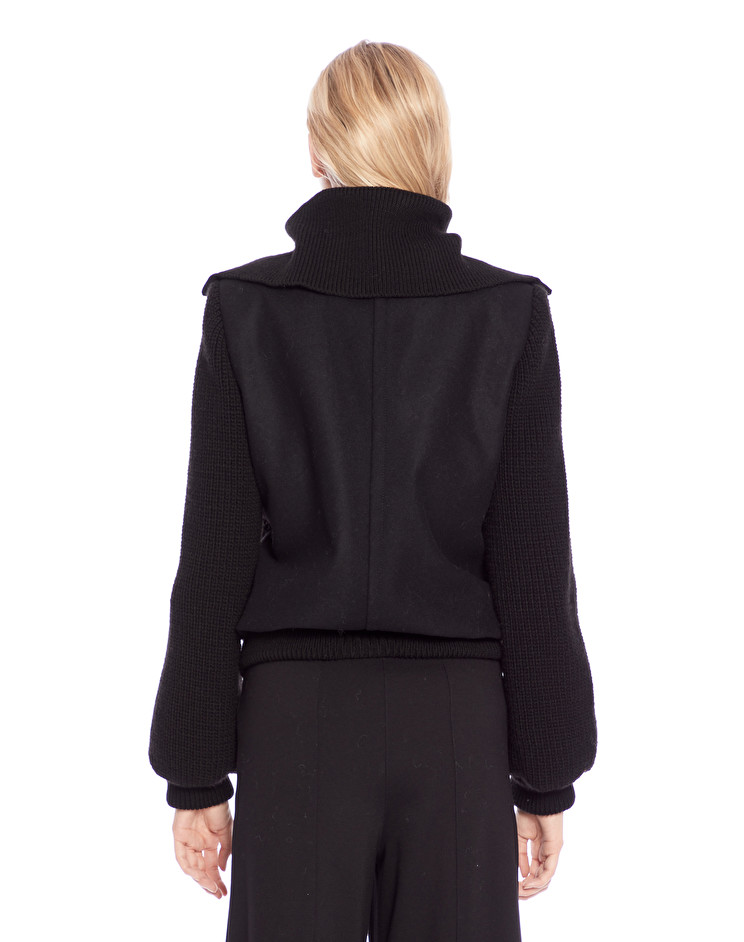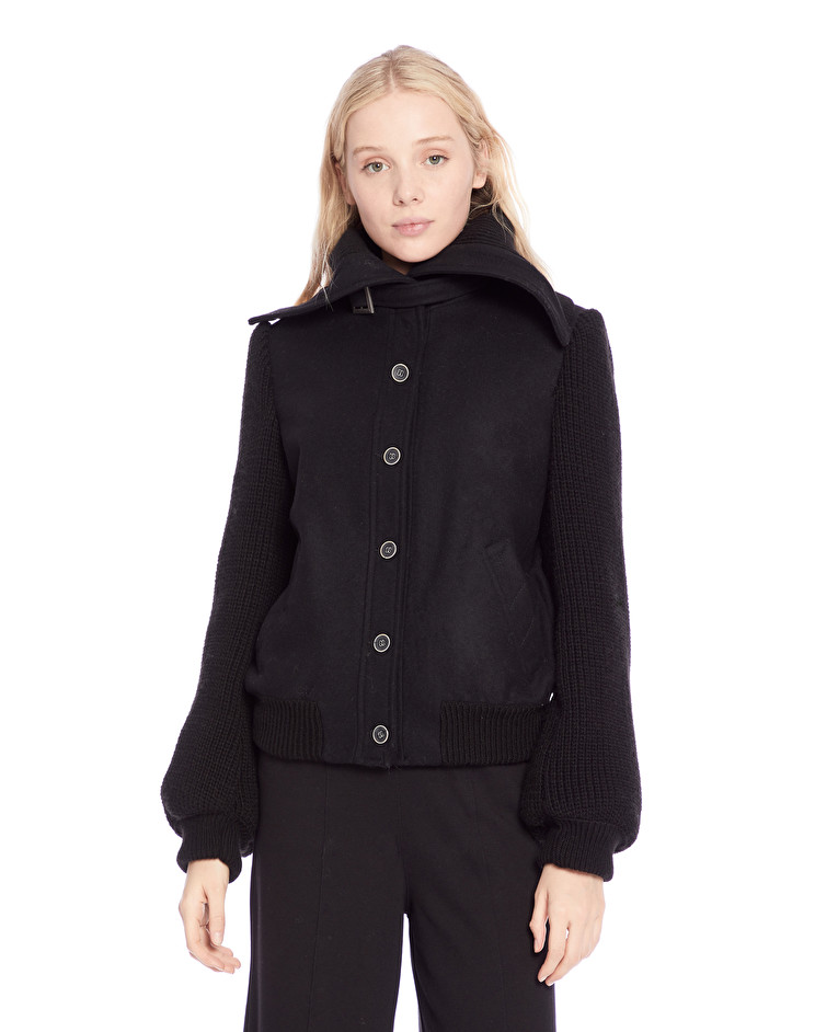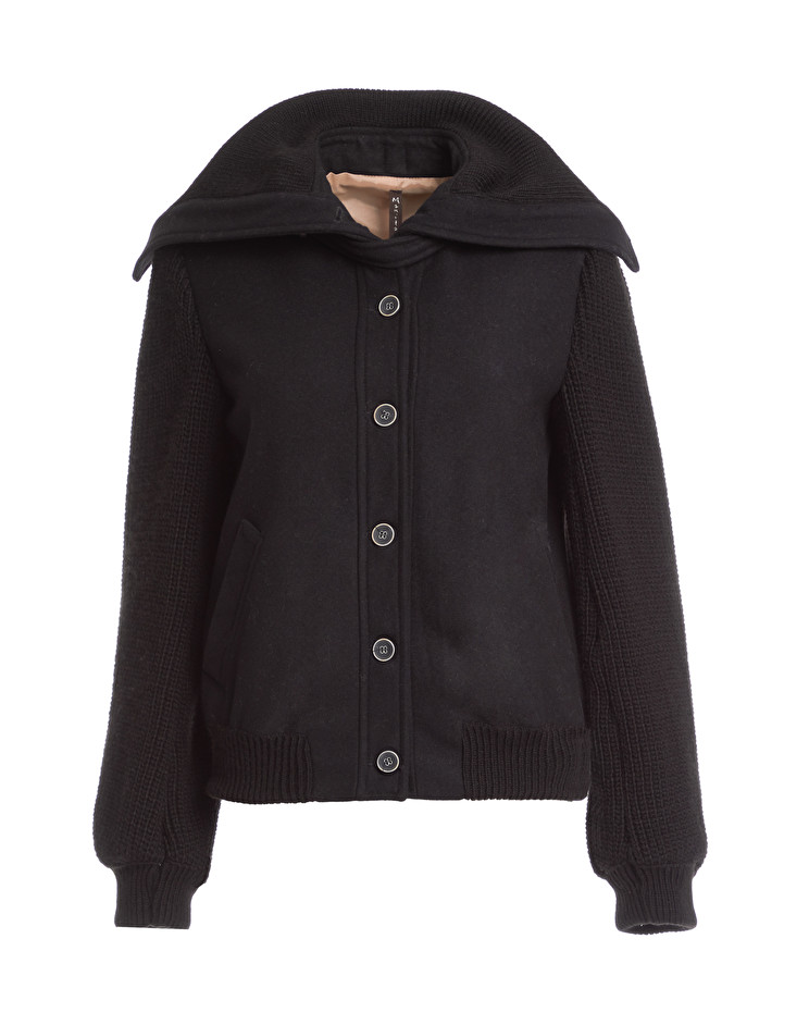 Description : Bomber en laine manches en point de jersey. Le mannequin porte une taille 42 et mesure 179 cm.