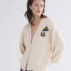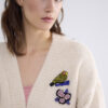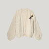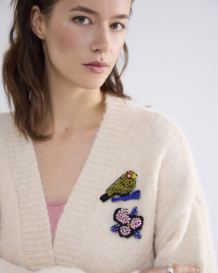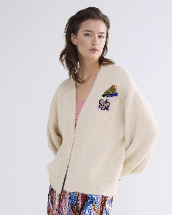 Oversized cardigan with wide puffy sleeves. Embellished with 2 Brooches that you also can take off if you want. Knitted in a very soft yarn.