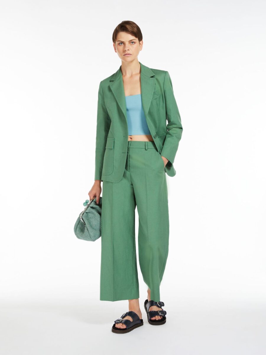 Figure-skimming single-breasted blazer in lightweight linen-blend canvas. The half-lined model boasts a classic lapel collar, buttoned-hem long sleeves and flap-adorned patch front pockets. Embellished with a breast pocket and central rear vent.