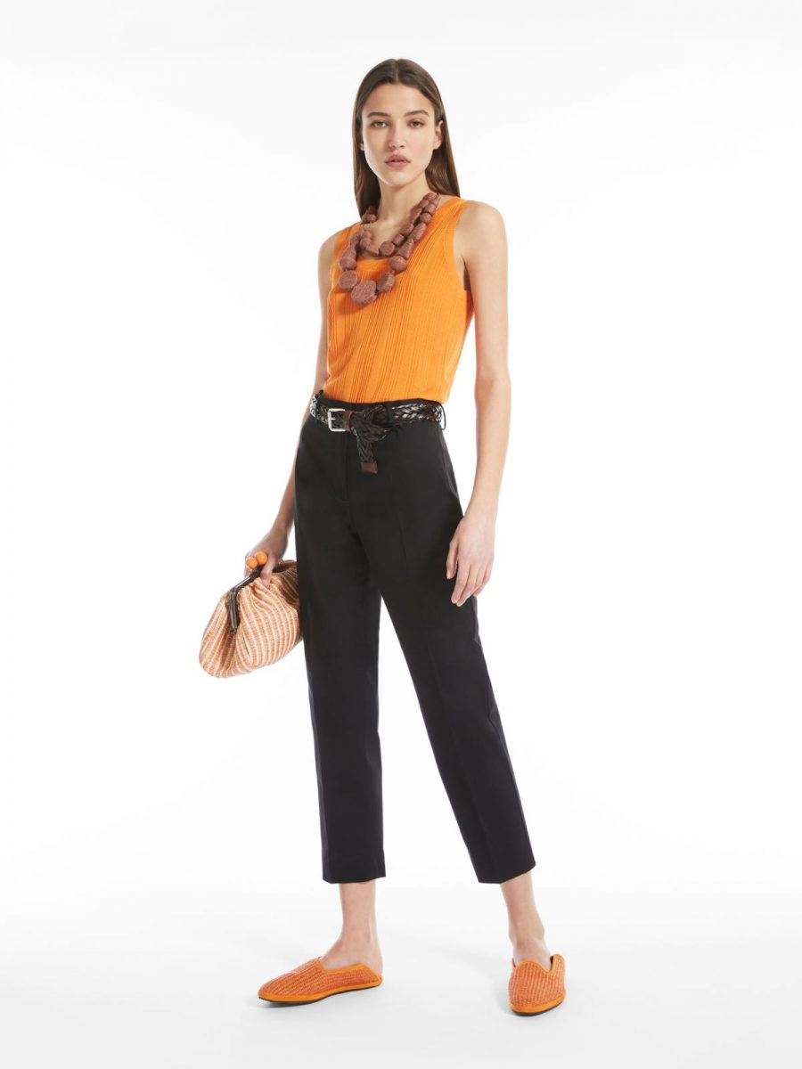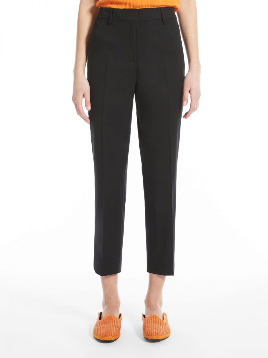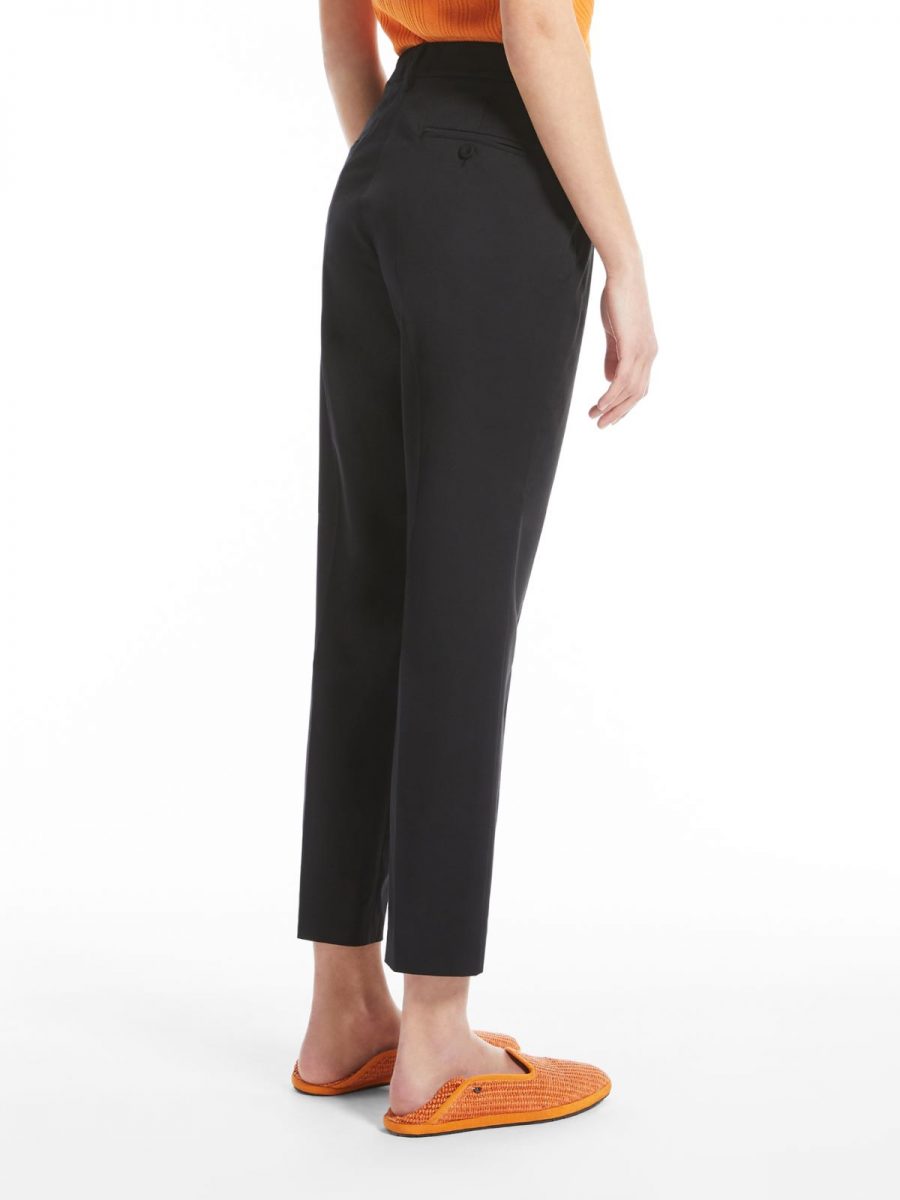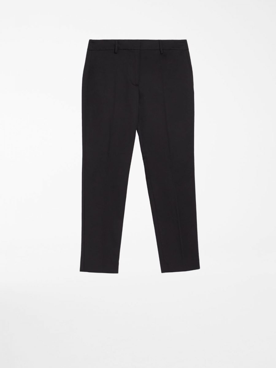 Stretch cotton gabardine slim trousers featuring central pressed pleat detail and welt rear pockets. Fly-covered zip and hook-and-bar fastening on the front. Straight fit. Length: 95 cm.