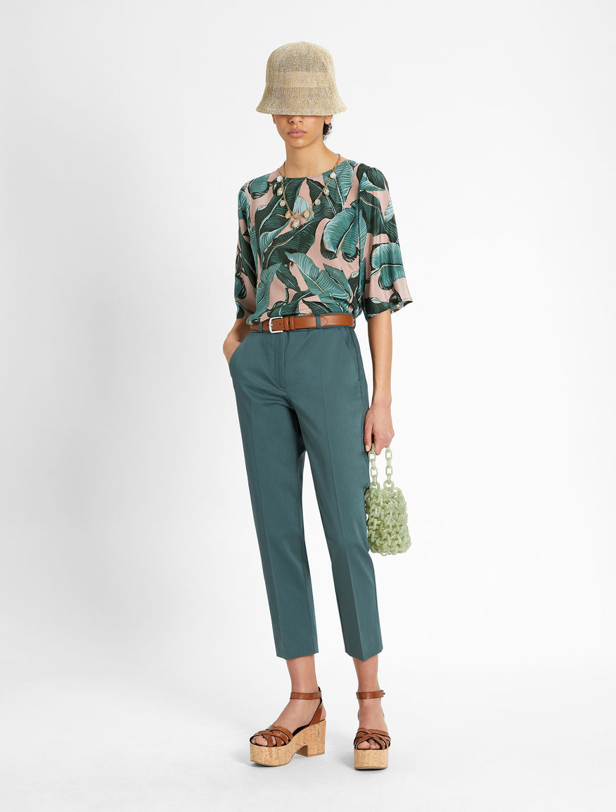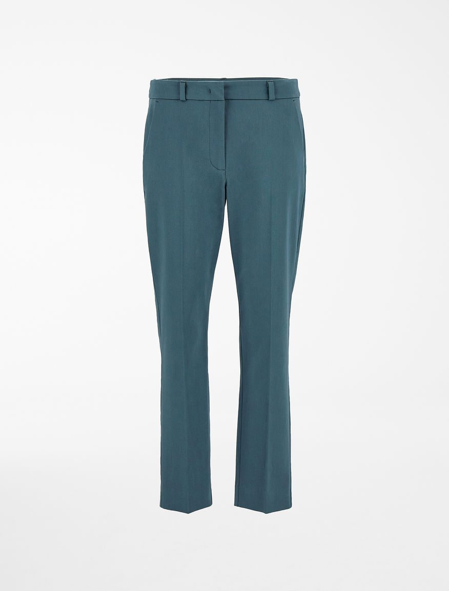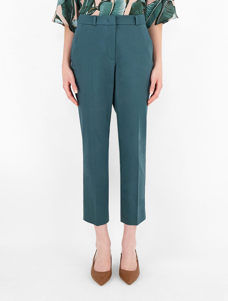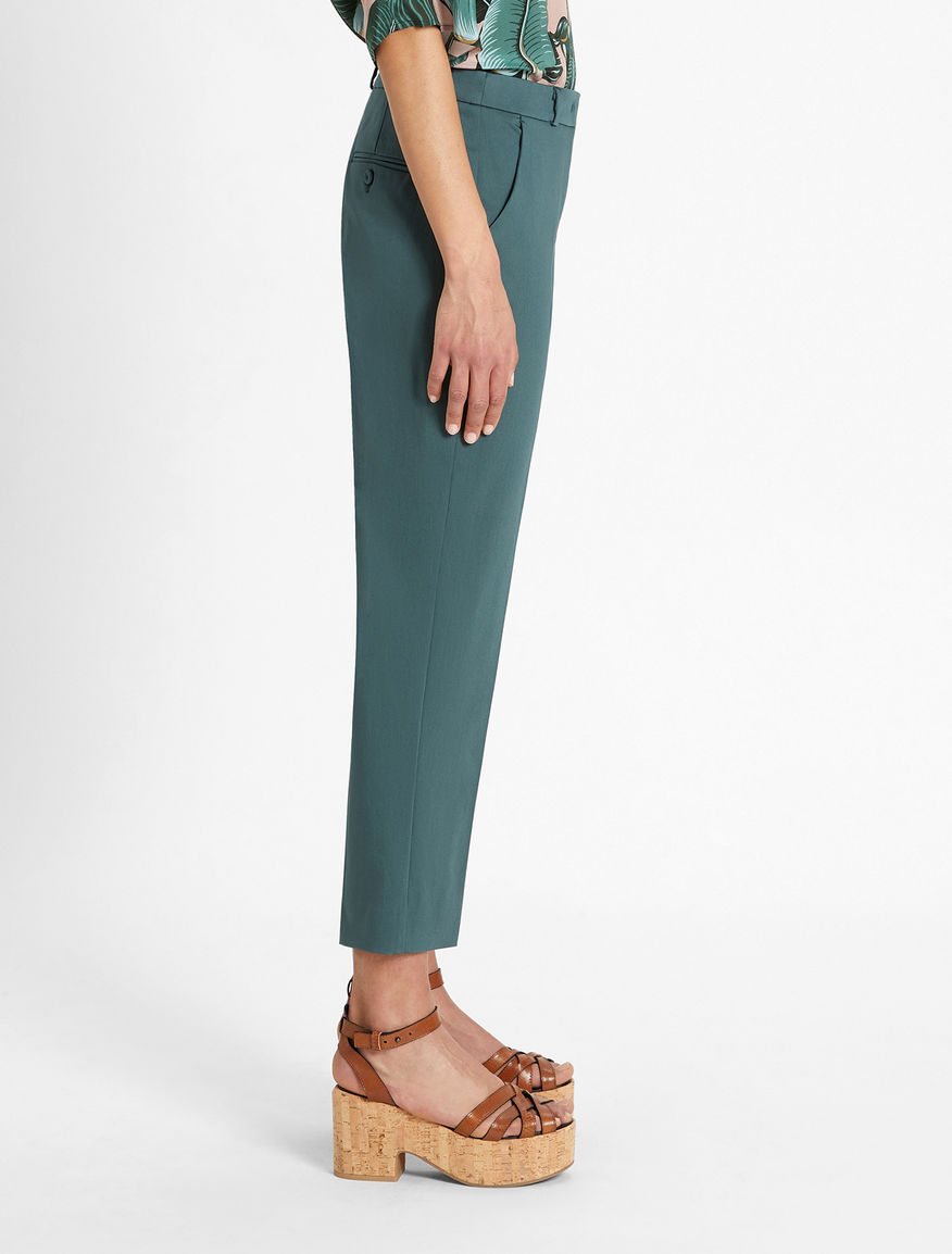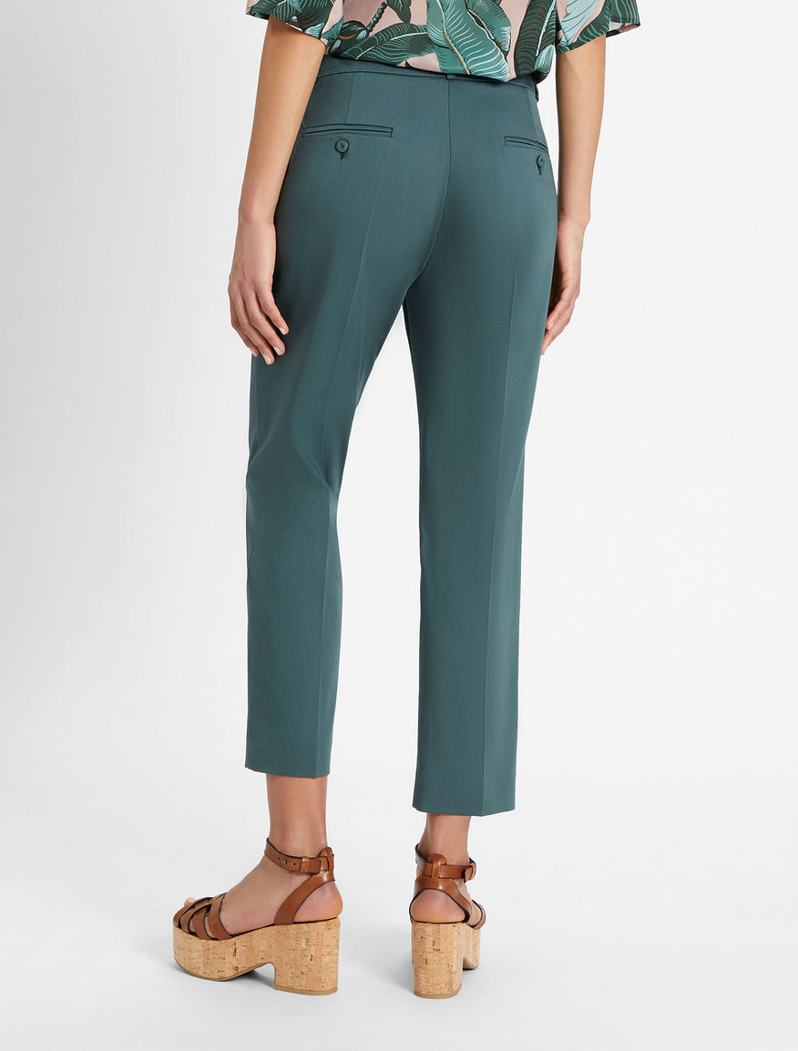 Slim-fit cigarette trousers in stretch cotton sateen with a pressed pleat on the leg, slant side pockets and welt back pockets with button. Fly-covered zip and a small hook-and-eye fastening.