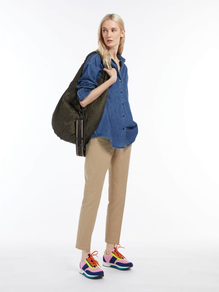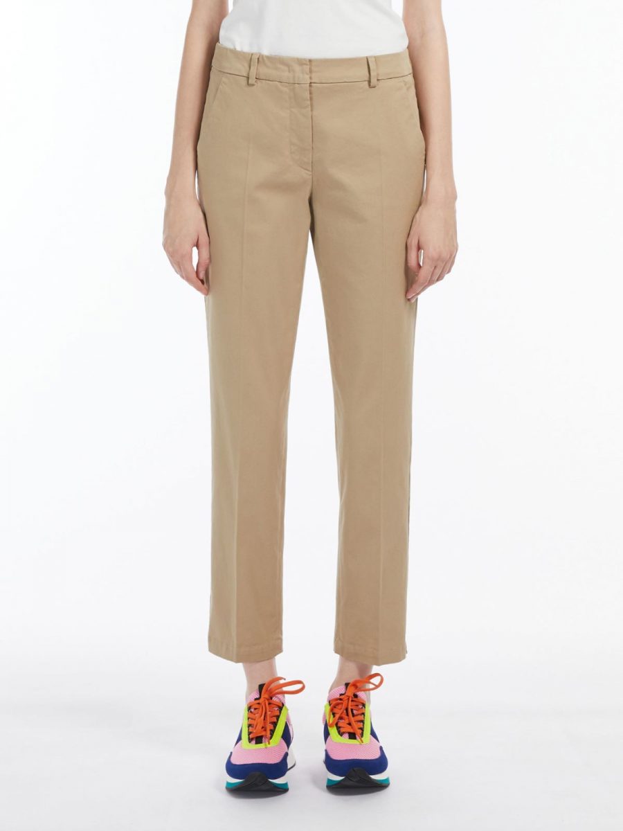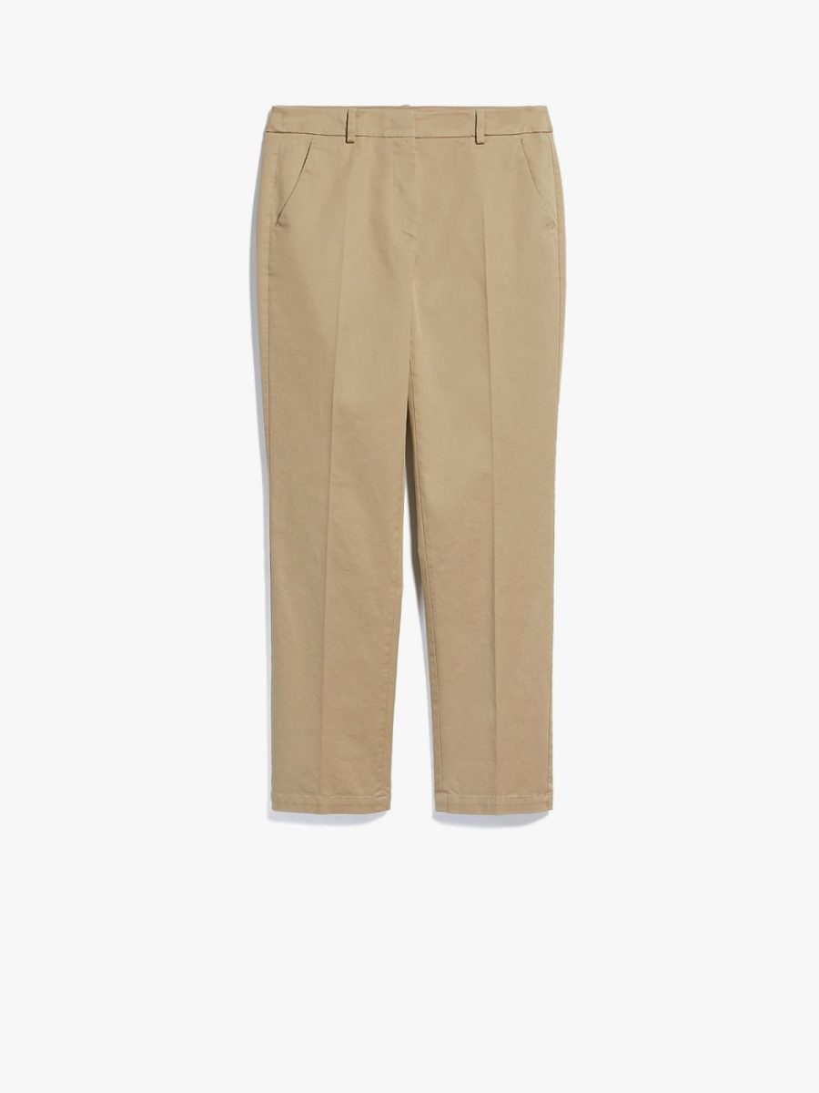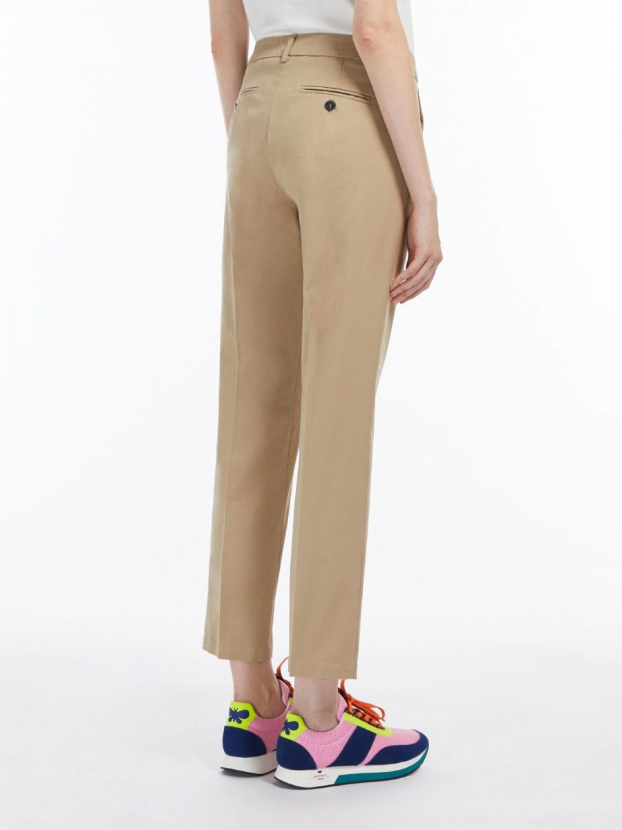 Classic, straight-fit cropped trousers in cotton twill fabric featuring pressed pleat detail. The model boasts slant side pockets and buttoned welt rear pockets. Fly-covered zip and hook-and-bar fastening.