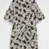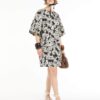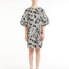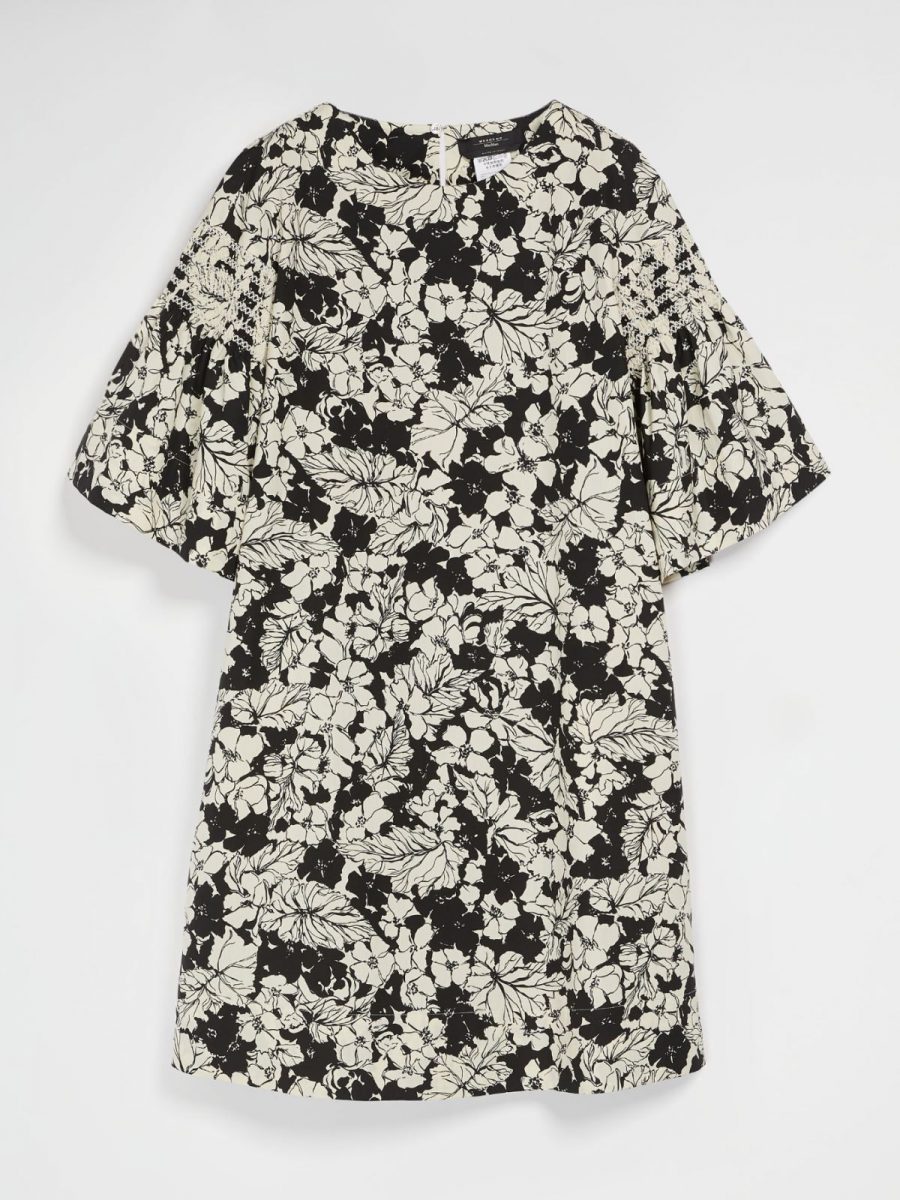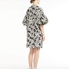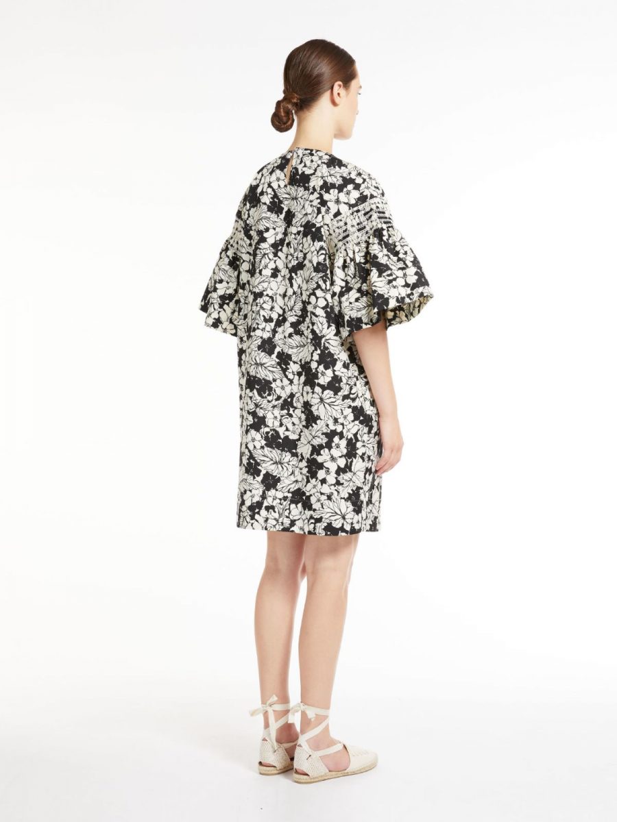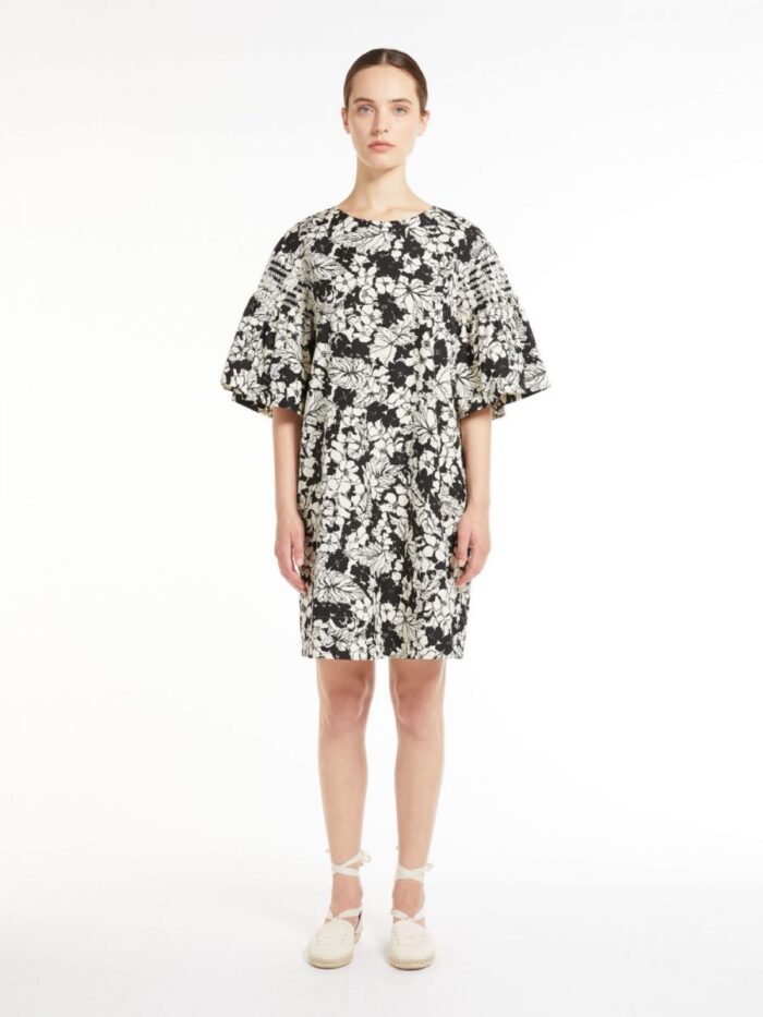 Printed pure cotton poplin dress featuring a crew neckline and in-seam side pockets. The straight-fit model is embellished with volume-bestowing smocked petal sleeves. Length: 95 cm.