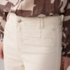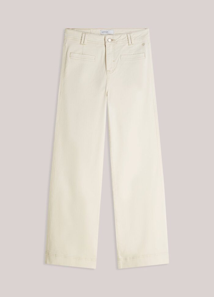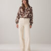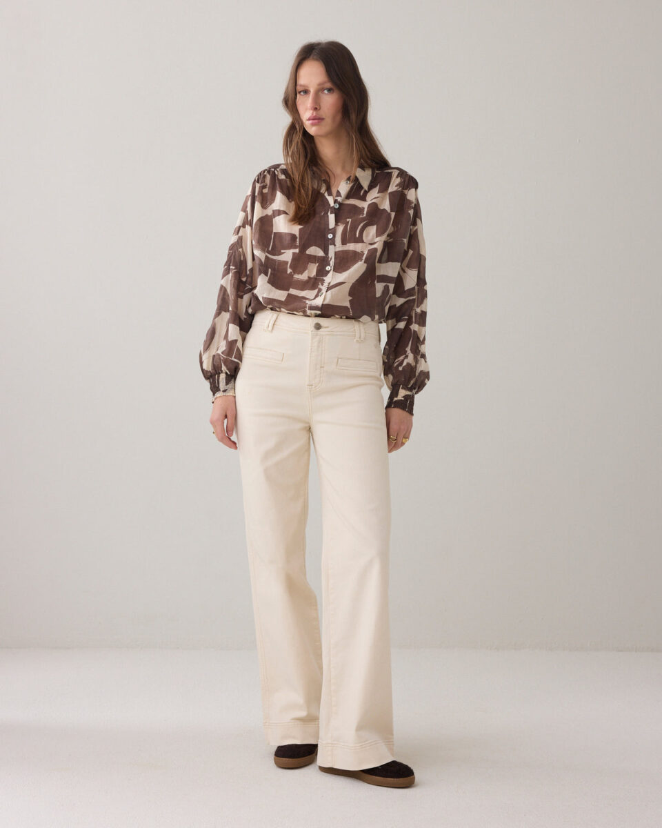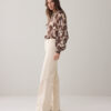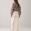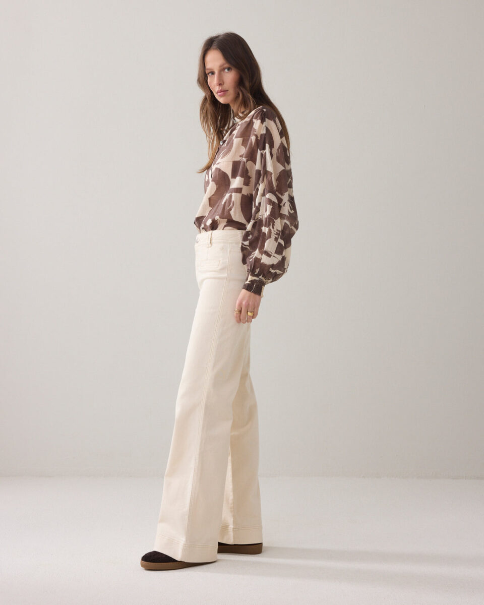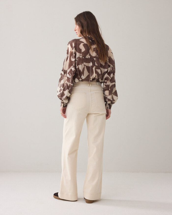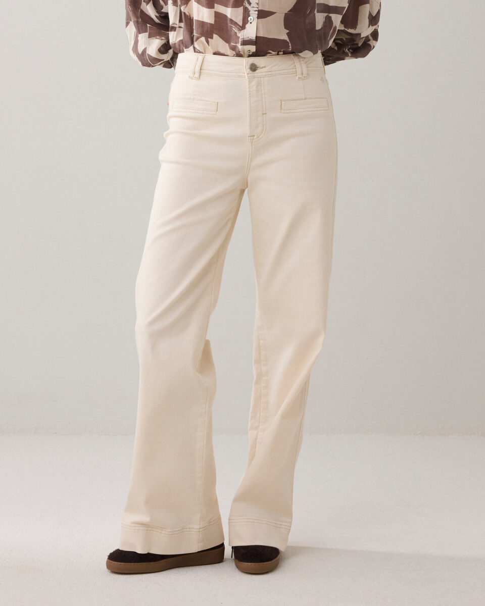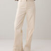 High-waisted trousers with a flared fit with a 70s vibe. This item fits tightly at the hips and thighs and flares wide from the knee. They feature two fake pockets on the front and patch pockets on the back.