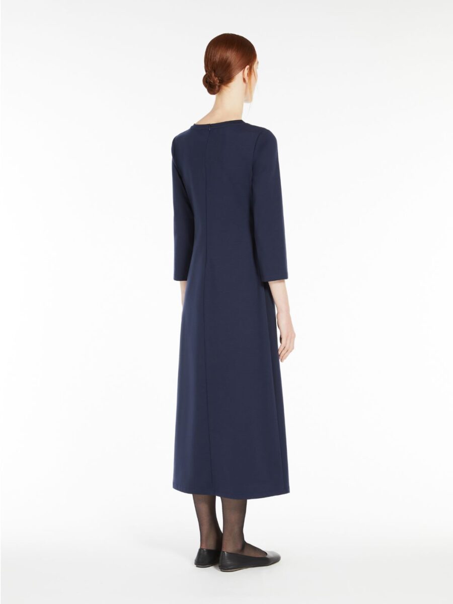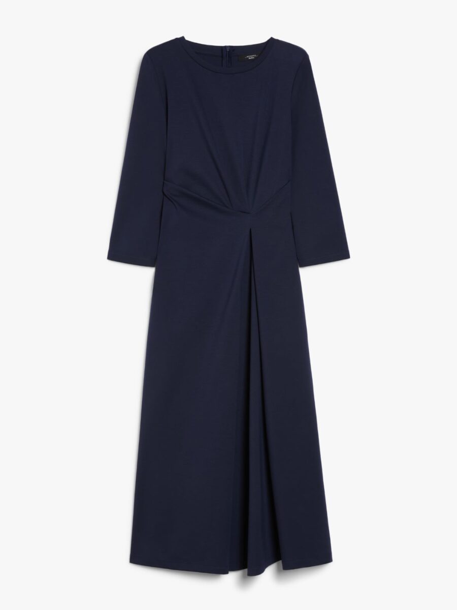 Milano-knit long dress in fluid lyocell jersey fabric. The model boasts a slightly fitted, draped waist, in addition to a flared skirt and inverted pleat detail on the front. It also features a crew neckline, 3/4 sleeves and a zip fastening on the back.