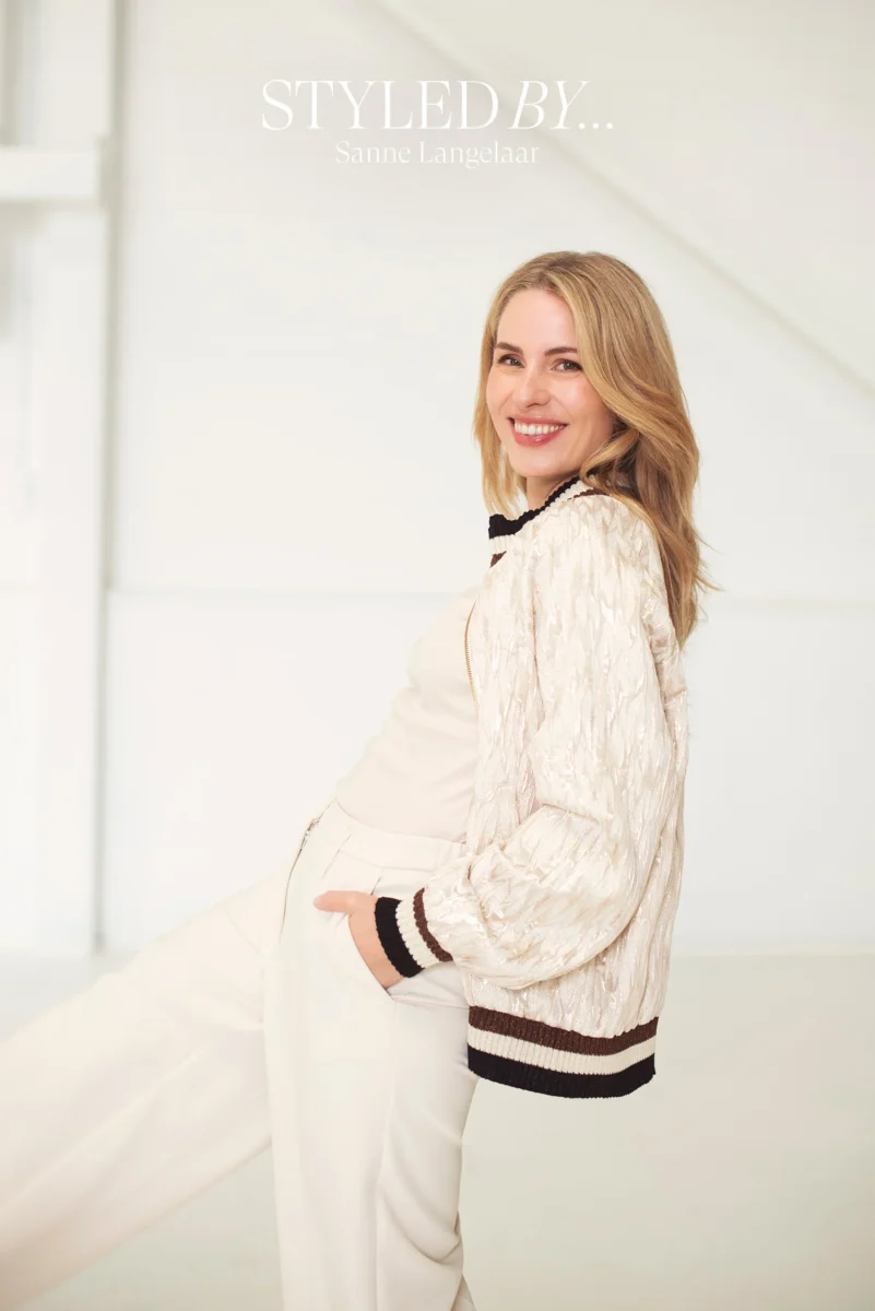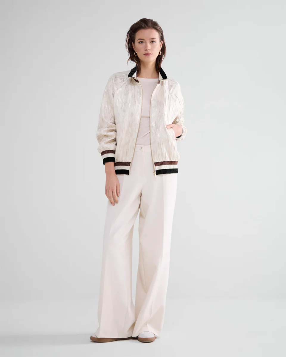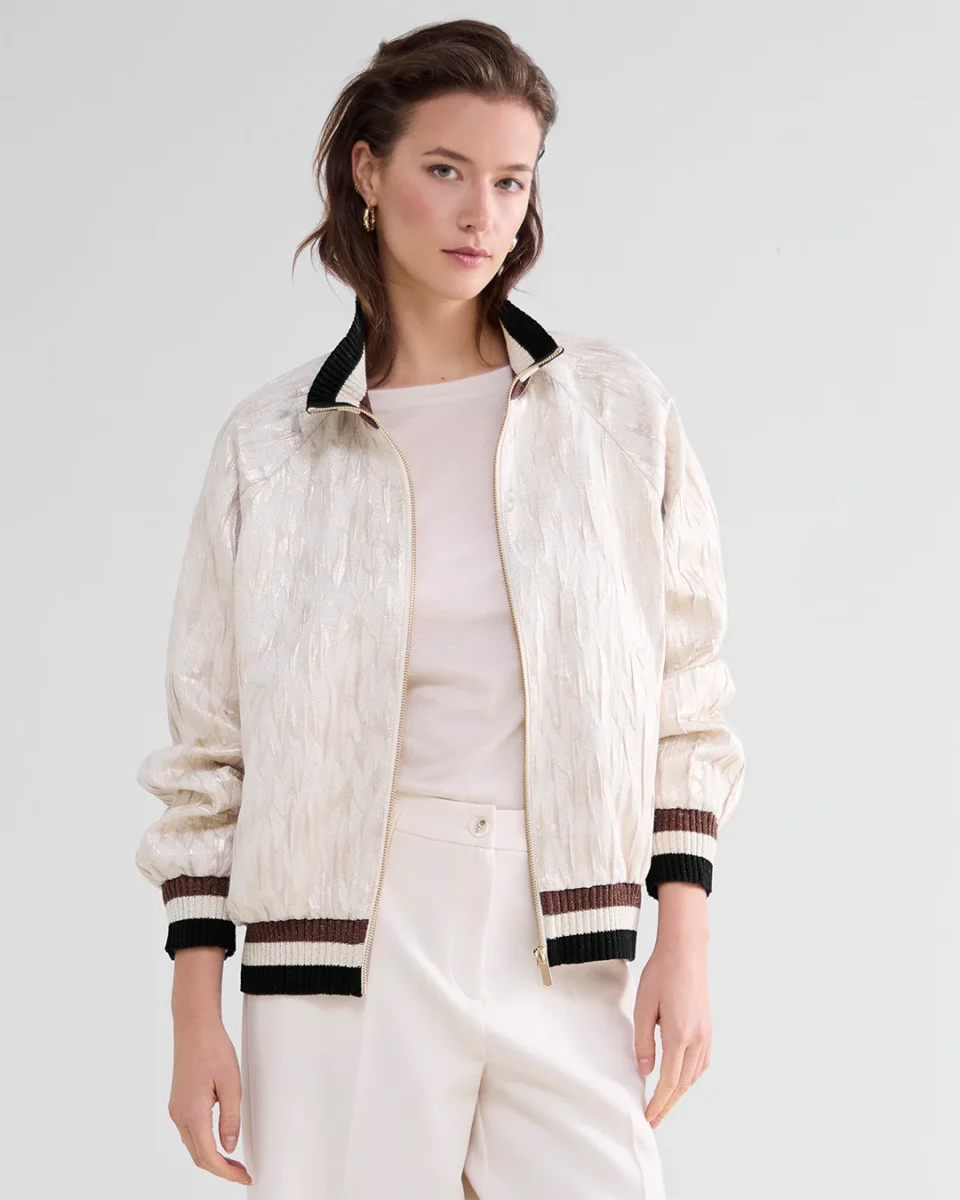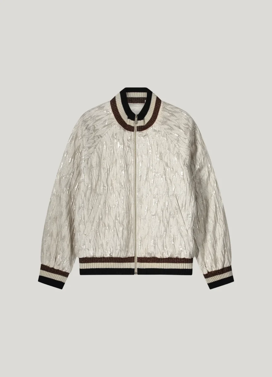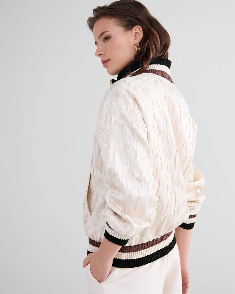 Jacquard bomber jacket with tactile structure. The jacket has contrasting striped ribbed edges and slanted strip pockets.