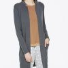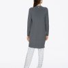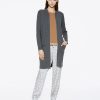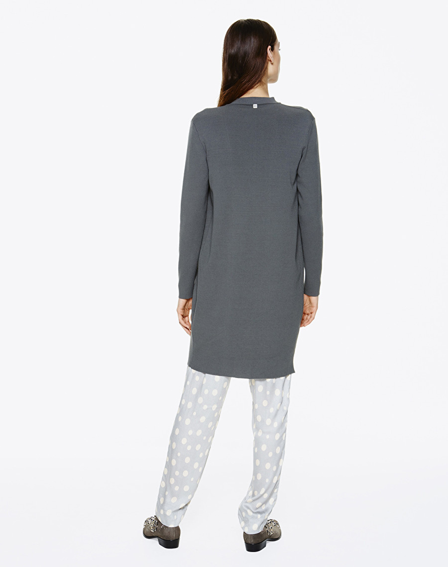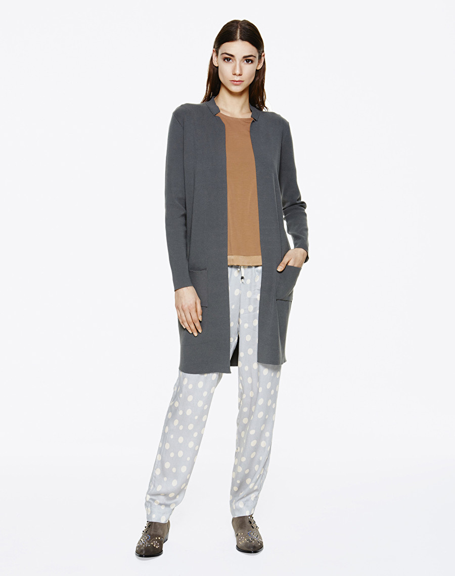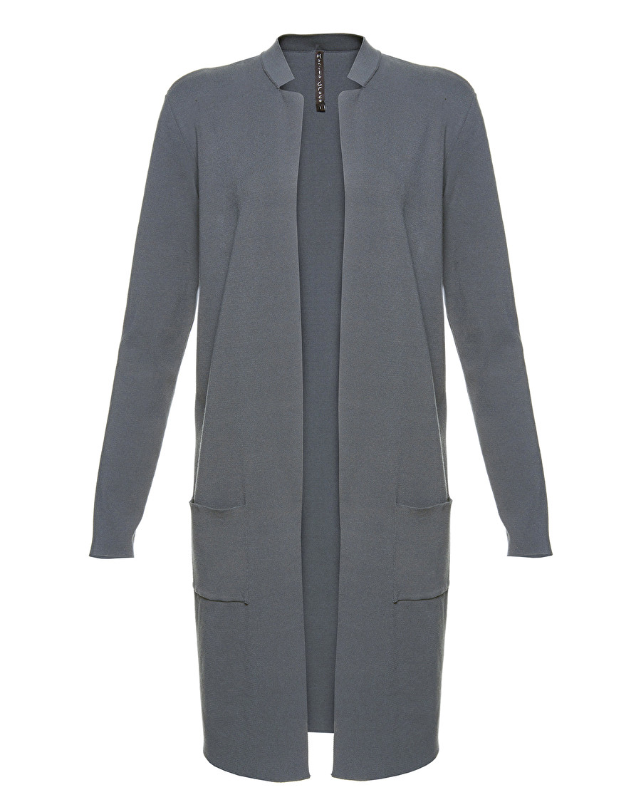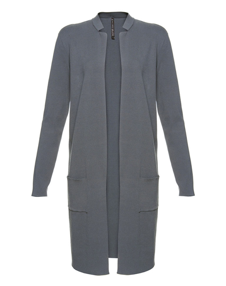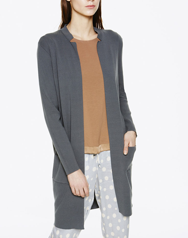 Manteau en maille légère ouvert sur le devant, petit col en côtes et poches latérales.