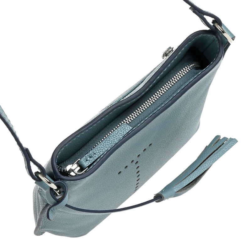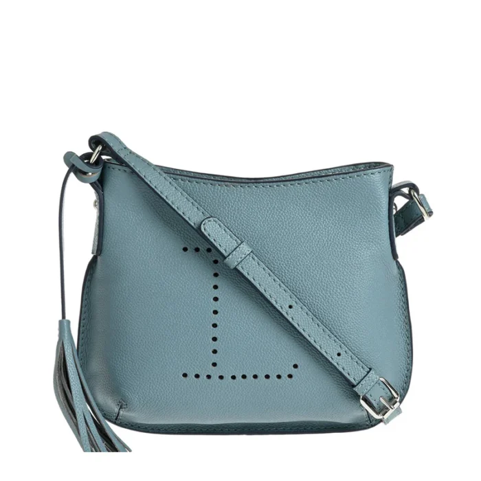 Sac crossover en cuir Suédé doté d’un « L », sur la face avant réalisé avec des micro perforations.