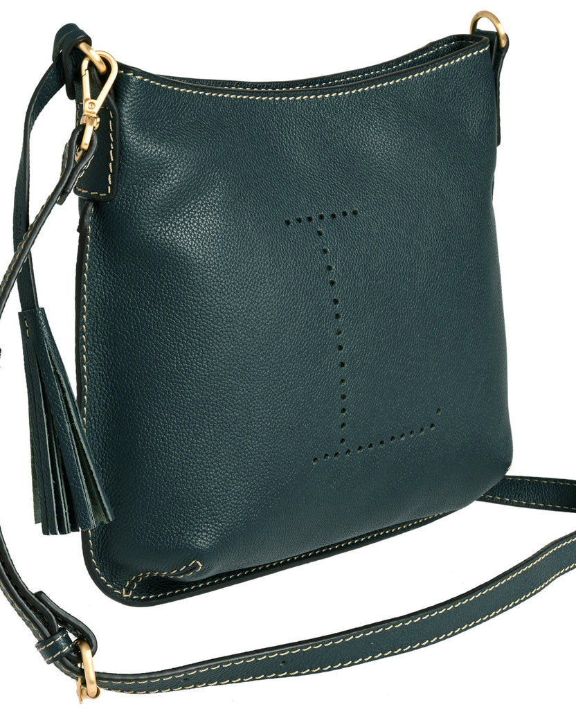 Sac crossover en cuir Suédé doté d’un « L », sur la face avant réalisé avec des micro perforations.