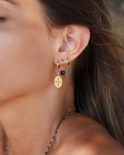 Discrétion et sobriété font tout le charme d’Ava. Ses boucles d’oreilles travaillées se terminent par une petite pierre naturelle pleine de délicatesse. Idéale pour parfaire un look.