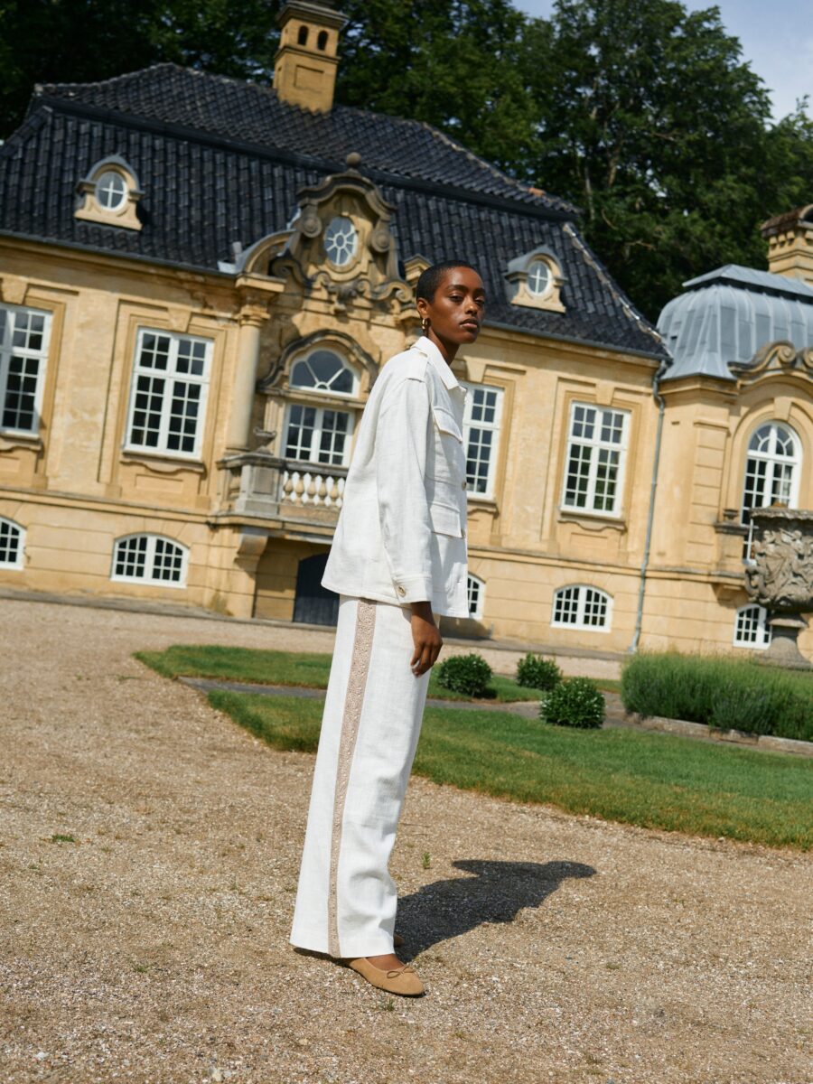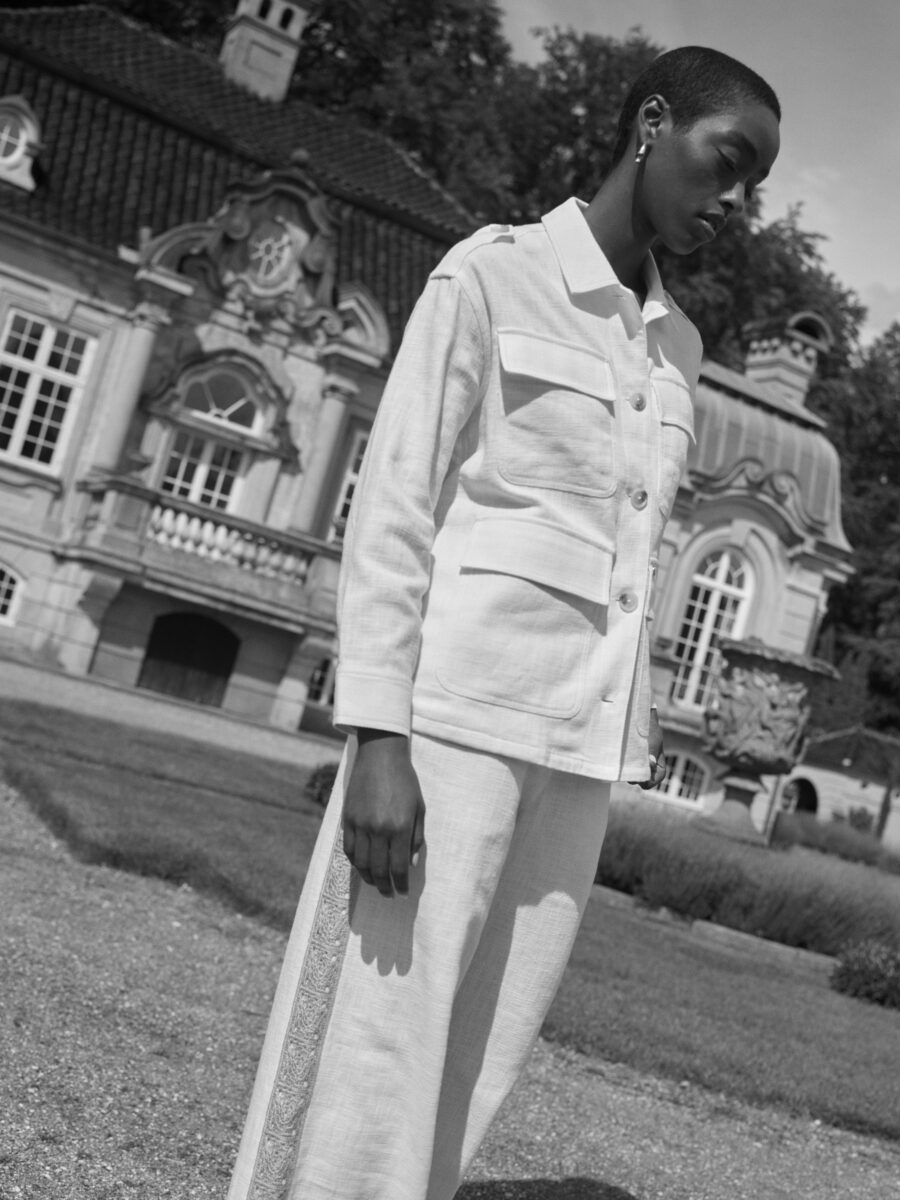 Embrace a touch of adventure with this safari-inspired jacket, crafted from a blend of cotton and ramie for a structured, linen-like appearance. Featuring large utility pockets, shoulder straps, and light brown buttons, it pairs perfectly with the matching pants for an effortlessly coordinated look.