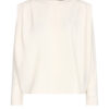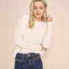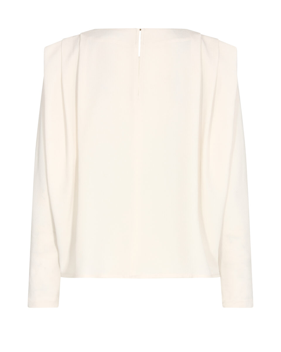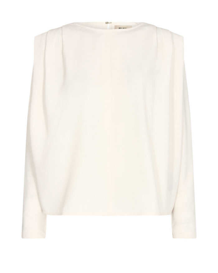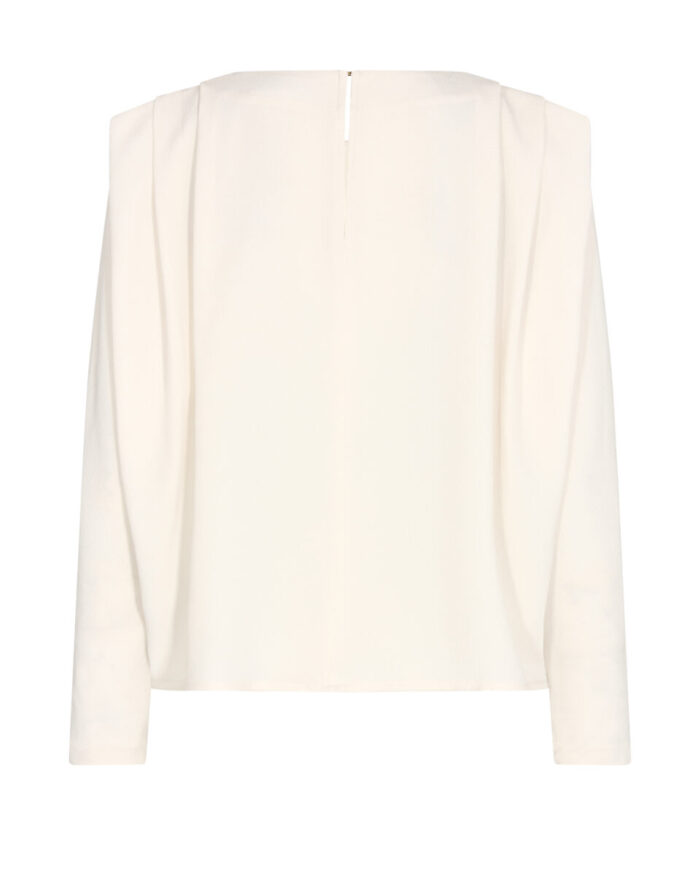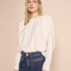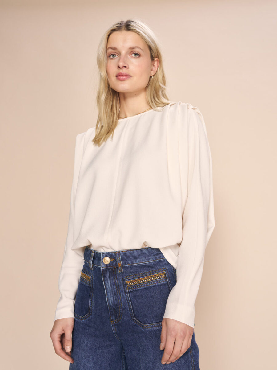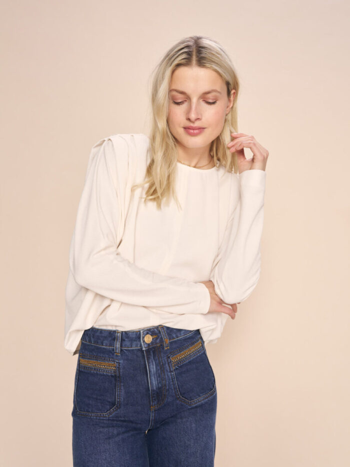 This beautiful blouse is crafted from an exclusive blend and inspired by the cool 80s. It’s designed in a loose silhouette with pleat details at the shoulders, bad wings (sleeves), and a cute keyhole at the back. We would style it with tailored pants or together with a chic skirt.