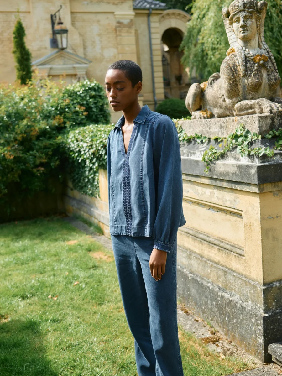 Capture a bohemian spirit with this Tencel chambray blouse in a washed denim look. Adorned with intricate embroidery along the front, shoulders, and cuffs, it offers an ultra-soft feel that’s perfect for spring. Pair it with the matching pants for effortless style.