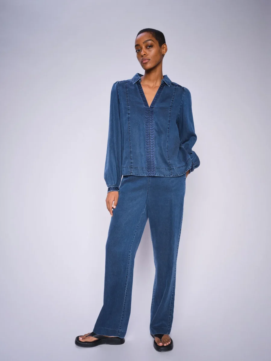 Slip into these gorgeous pants, crafted in a regular fit with a comfortable mid-rise. Made from ultra-soft Tencel with a smooth denim look, they feature embroidered details at the waistband and an elasticated back for an easy, comfortable fit. Pair with the matching blouse and tuck it in to highlight the intricate details.