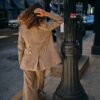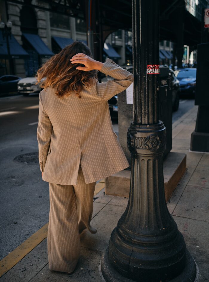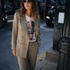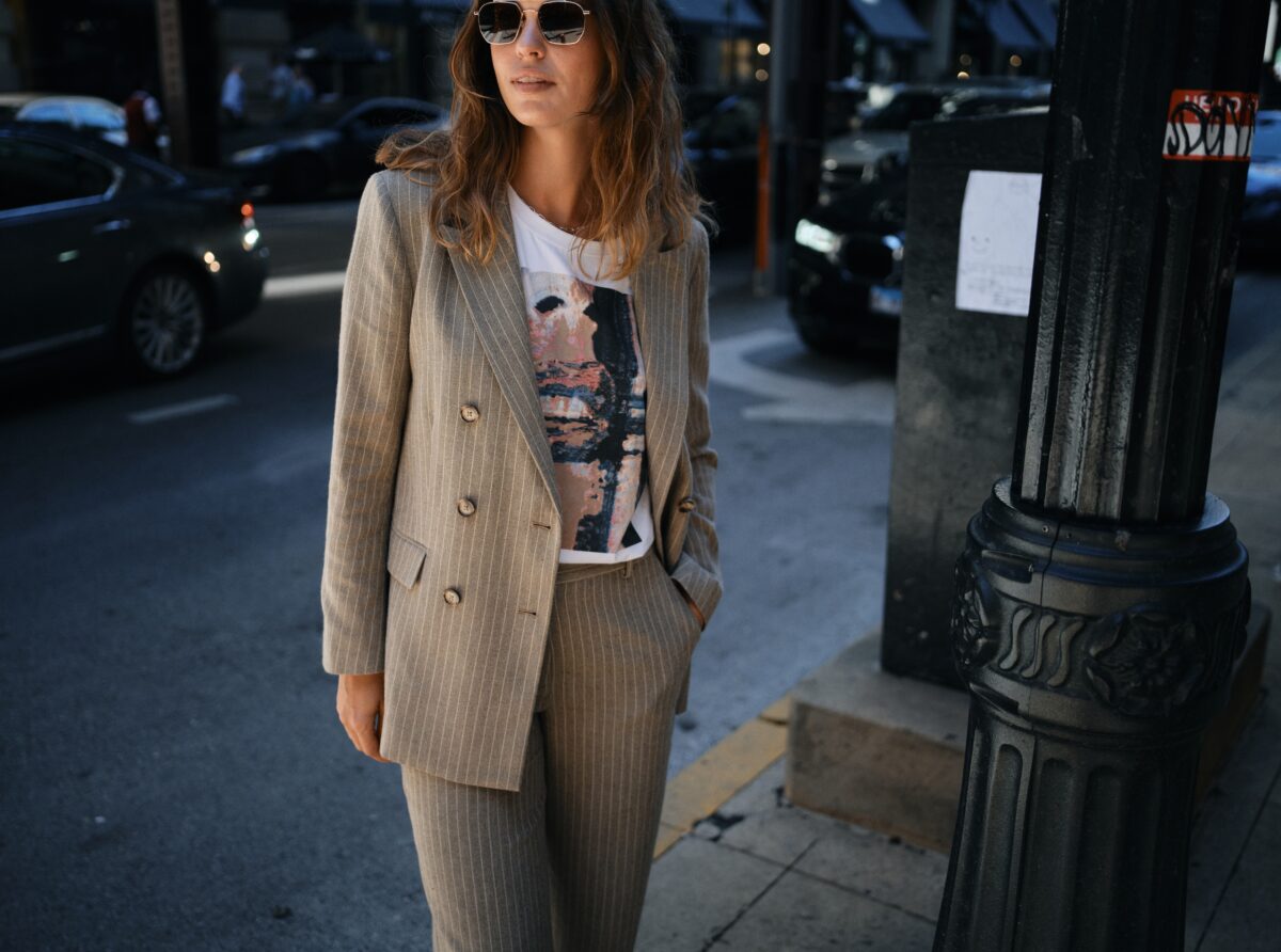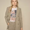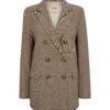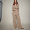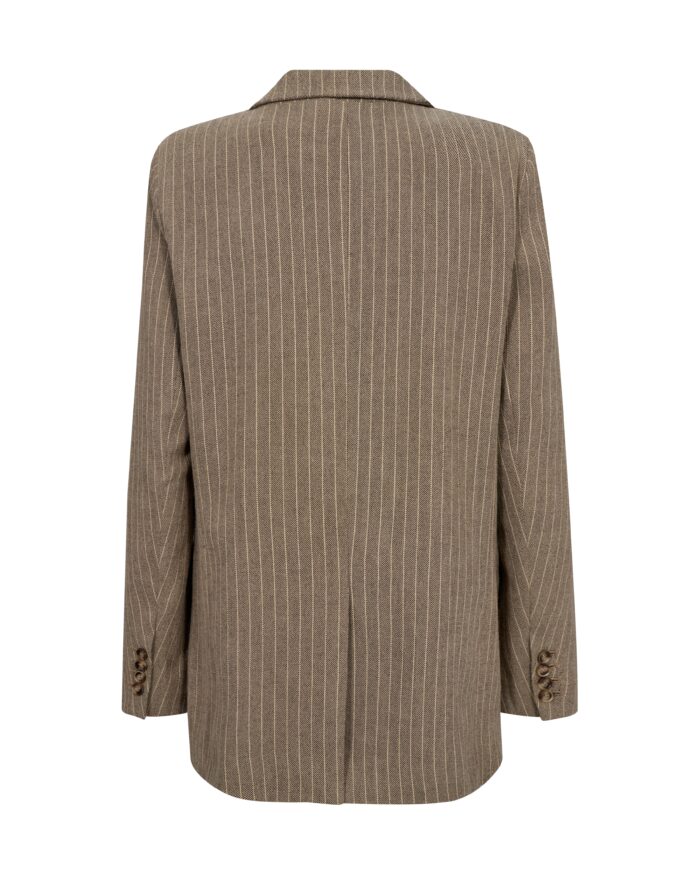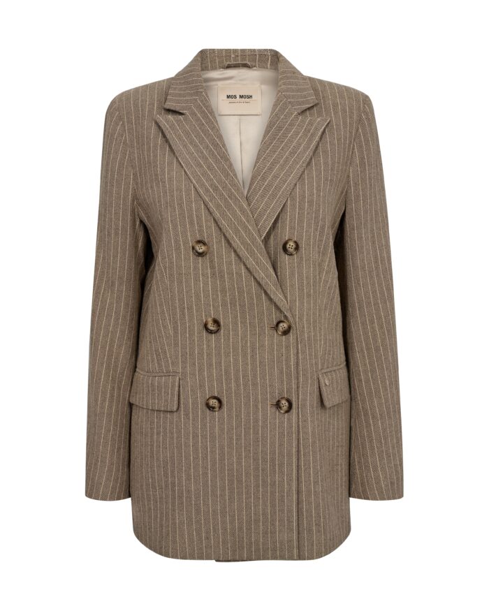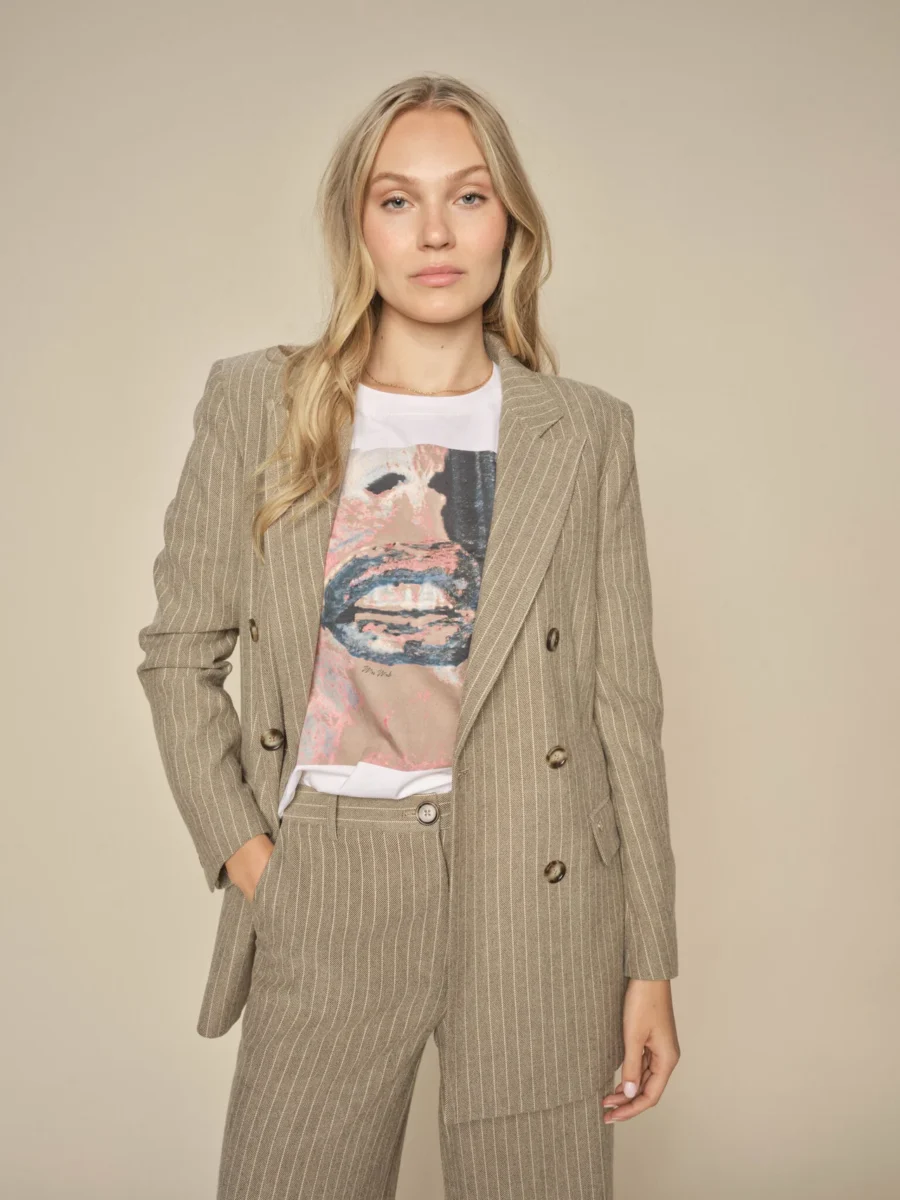 Embrace the return of pinstripes with our oversized double-breasted blazer, in a longer fit with classic details like notch lapels, flap pockets, and buttoned cuffs. Crafted from a soft woven quality with a hint of wool, it’s perfect for autumn days. Pair it effortlessly with a thin rollneck knit and matching tailored pants for a timeless yet contemporary look.