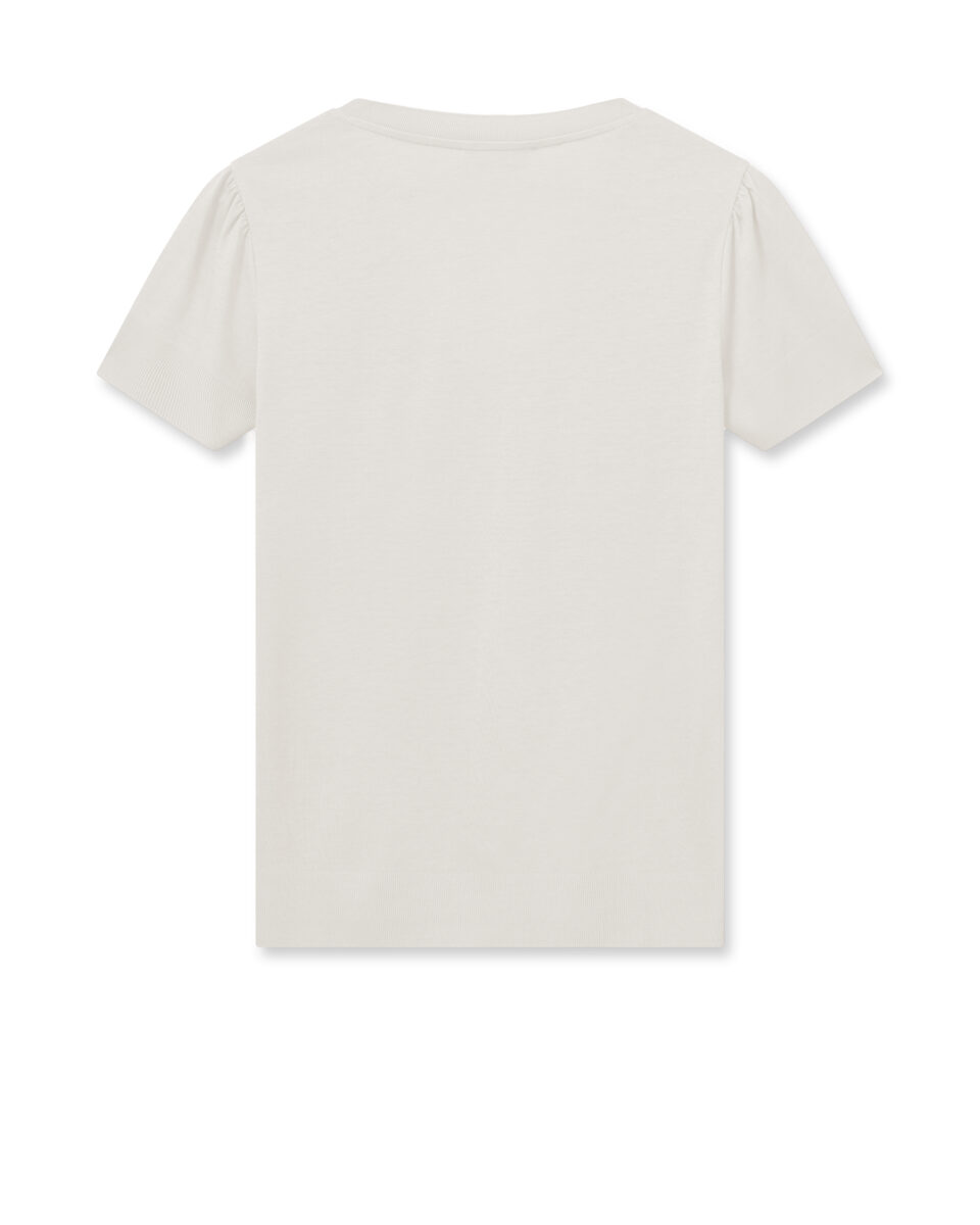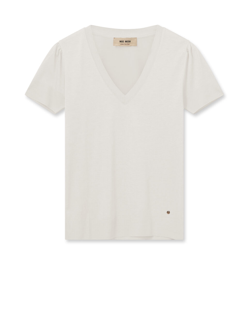 Embrace timeless elegance with this tee, designed in a slightly fitted silhouette that accentuates your form. The v-neckline is both flattering and refined, complemented by the delicate pleats at the shoulders. Finished with rib details at the neckline, cuffs, and hem, this versatile piece pairs effortlessly with jeans or shorts for a chic and comfortable ensemble.