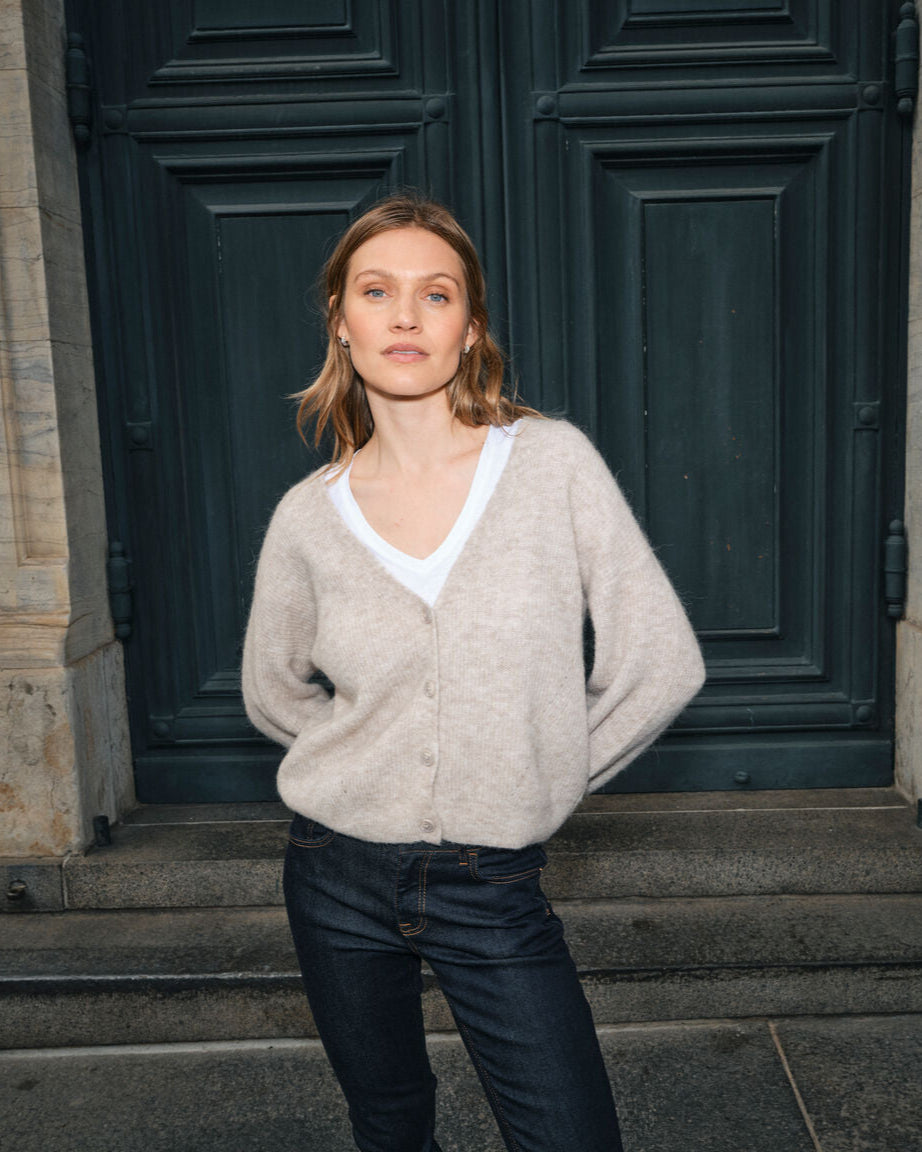 A knitted cardigan is essential. This cardigan is versatile, designed in a slightly cropped shape with a flattering v-neckline. It’s crafted from a soft, lightweight alpaca-wool blend and perfect with anything from jeans to shorts or layered over a dress.