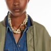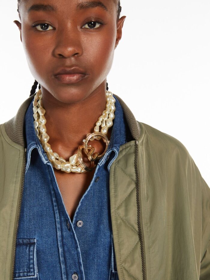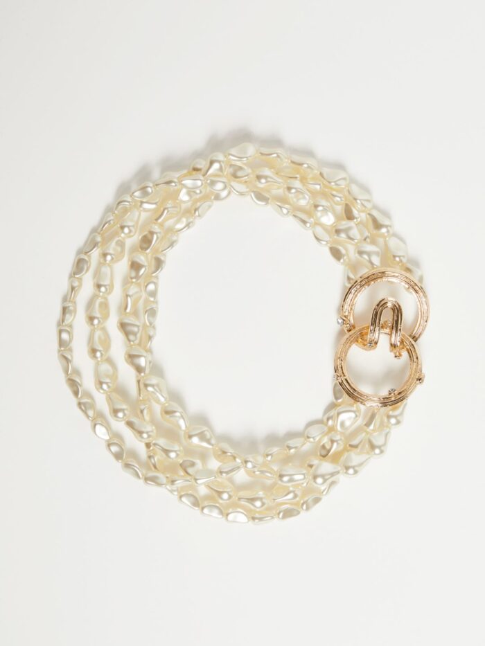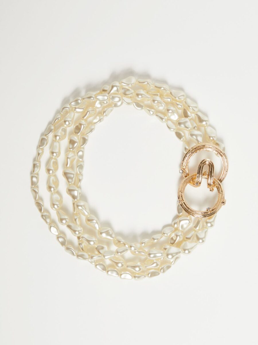 Choker necklace consisting of three strands of pearls. Featuring a maxi cut-out metal jewel fastening with rhinestone details.