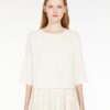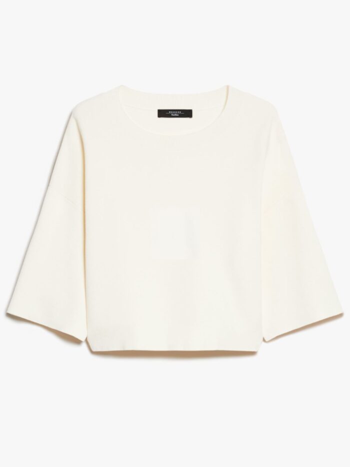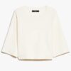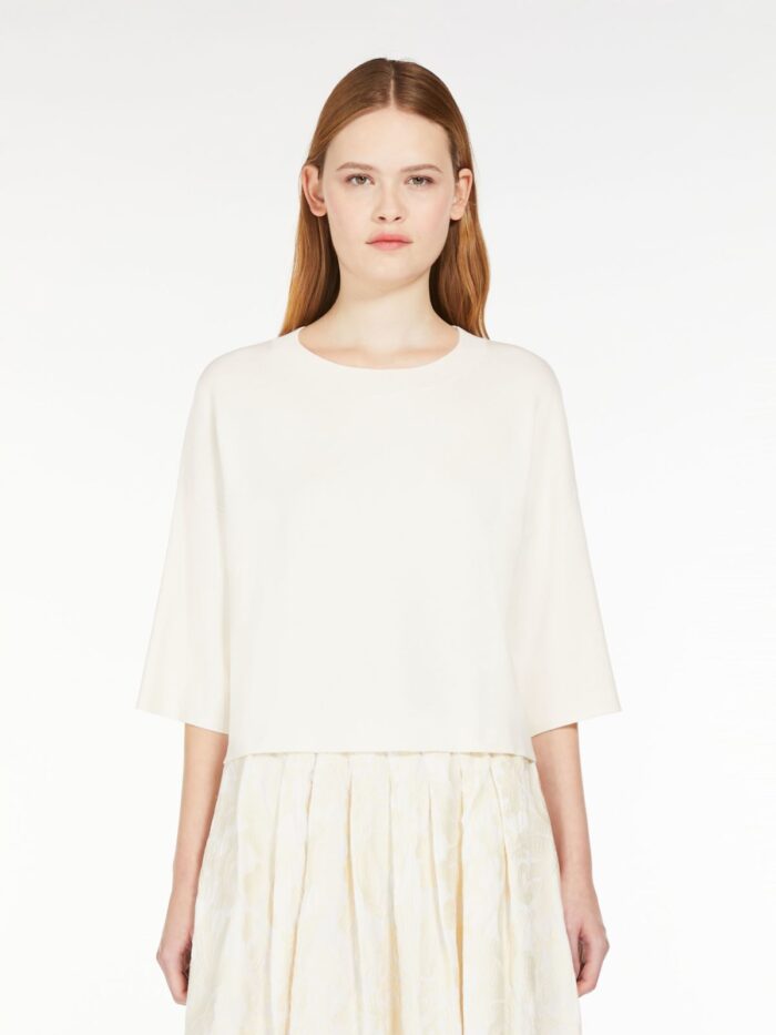 Boxy-fit crew-neck sweater in stretch viscose yarn. The model boasts a slightly cropped waist cut and drop-shoulder loose-fitting elbow-length sleeves. Rib-knit neck.