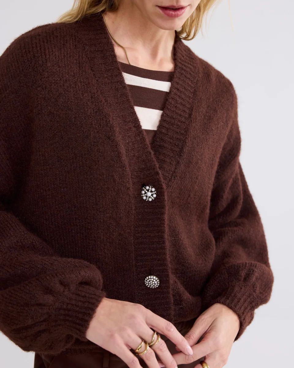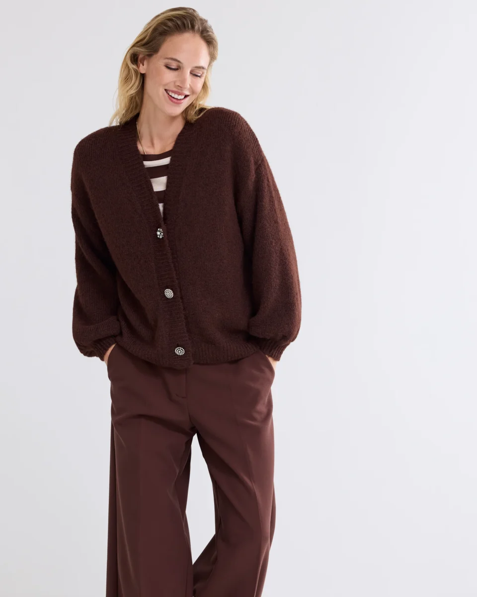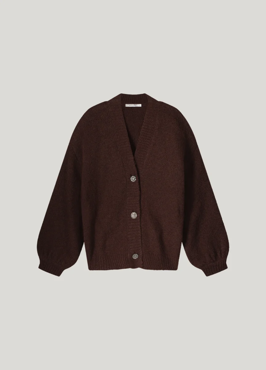 Oversized cardigan with wide puff sleeves, knitted in a very soft yarn. The brooches are removable. The cardigan has a button closure with several buttons and a lowered sleeve.