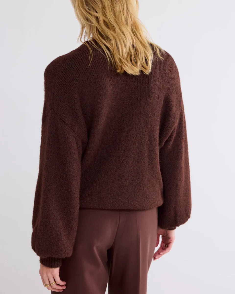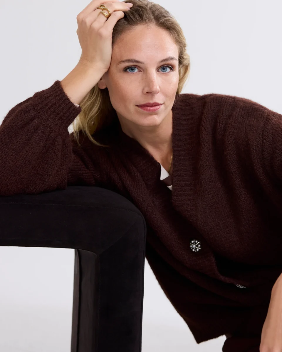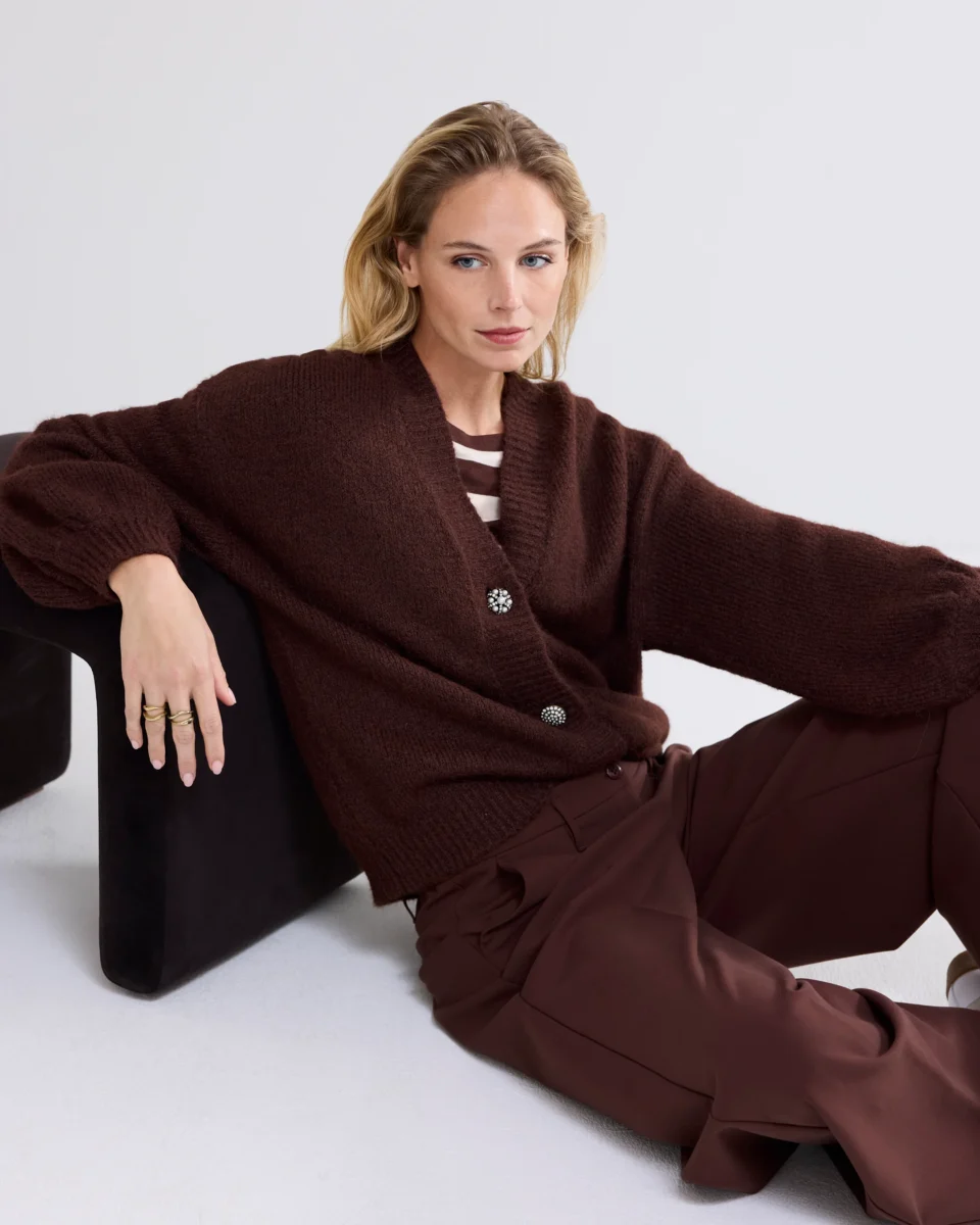 Oversized cardigan with wide puff sleeves, knitted in a very soft yarn. The brooches are removable. The cardigan has a button closure with several buttons and a lowered sleeve.