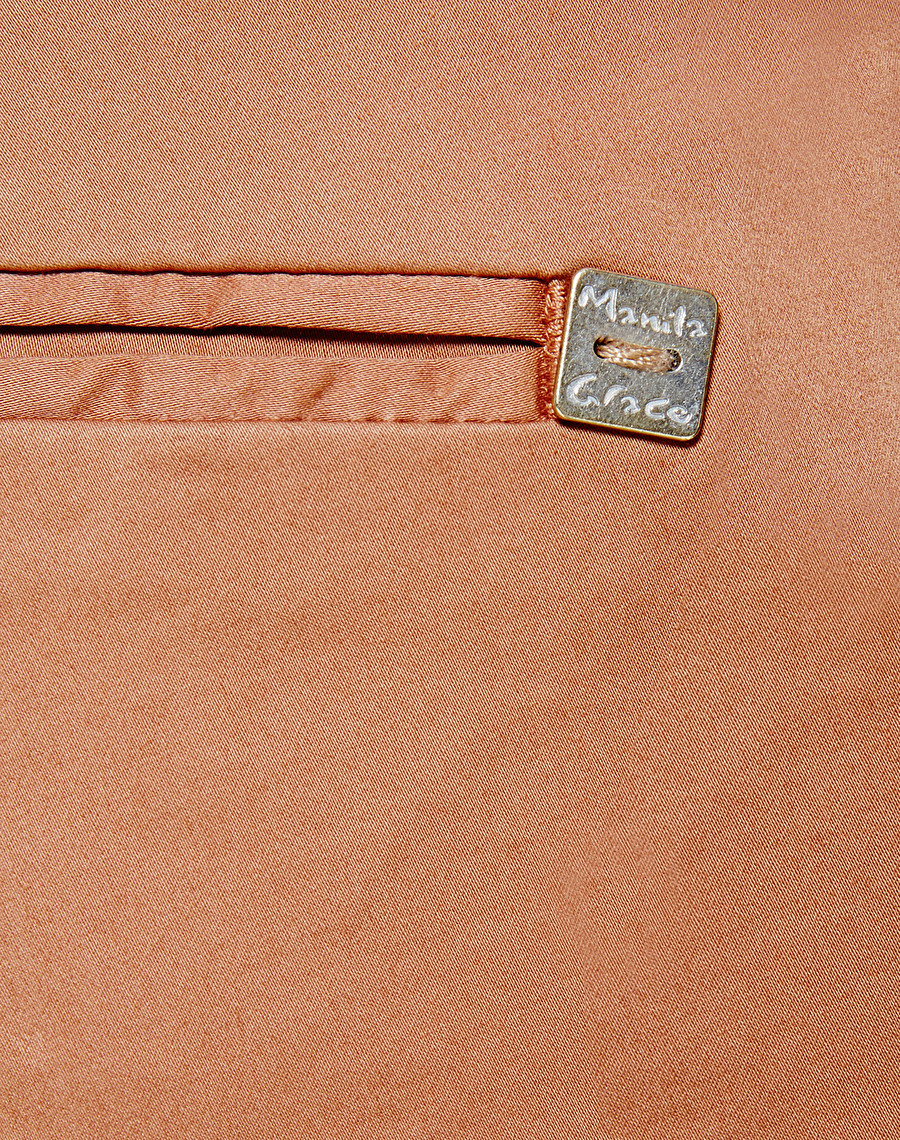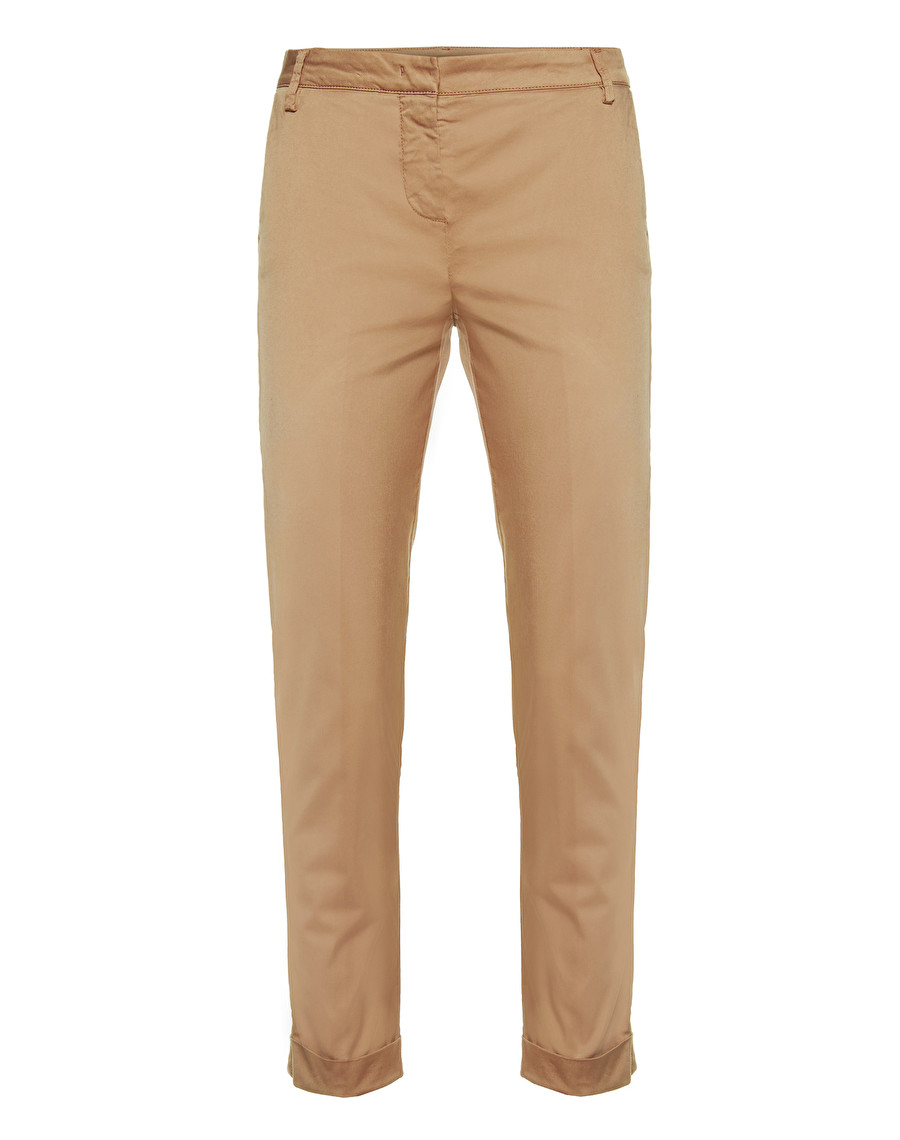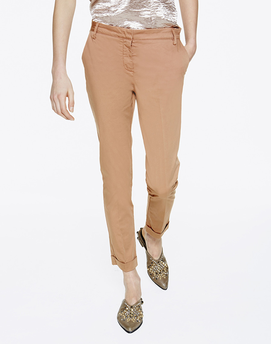 Pantalon chinot en satin de coton à revers. Taille haute. Fermeture éclair et crochet. Poches latérales. Le modèle mesure 175 cm et porte une taille 40 italienne.