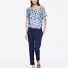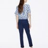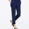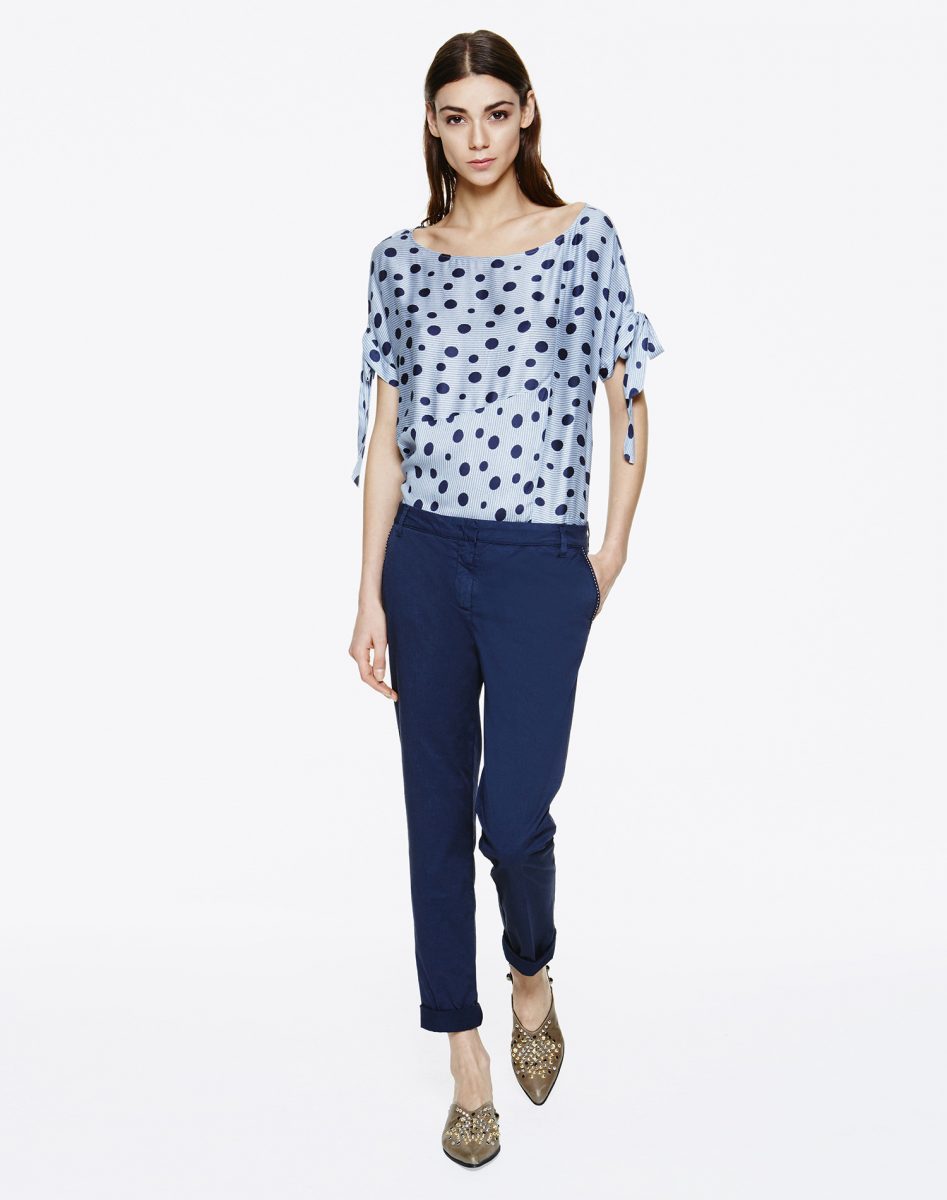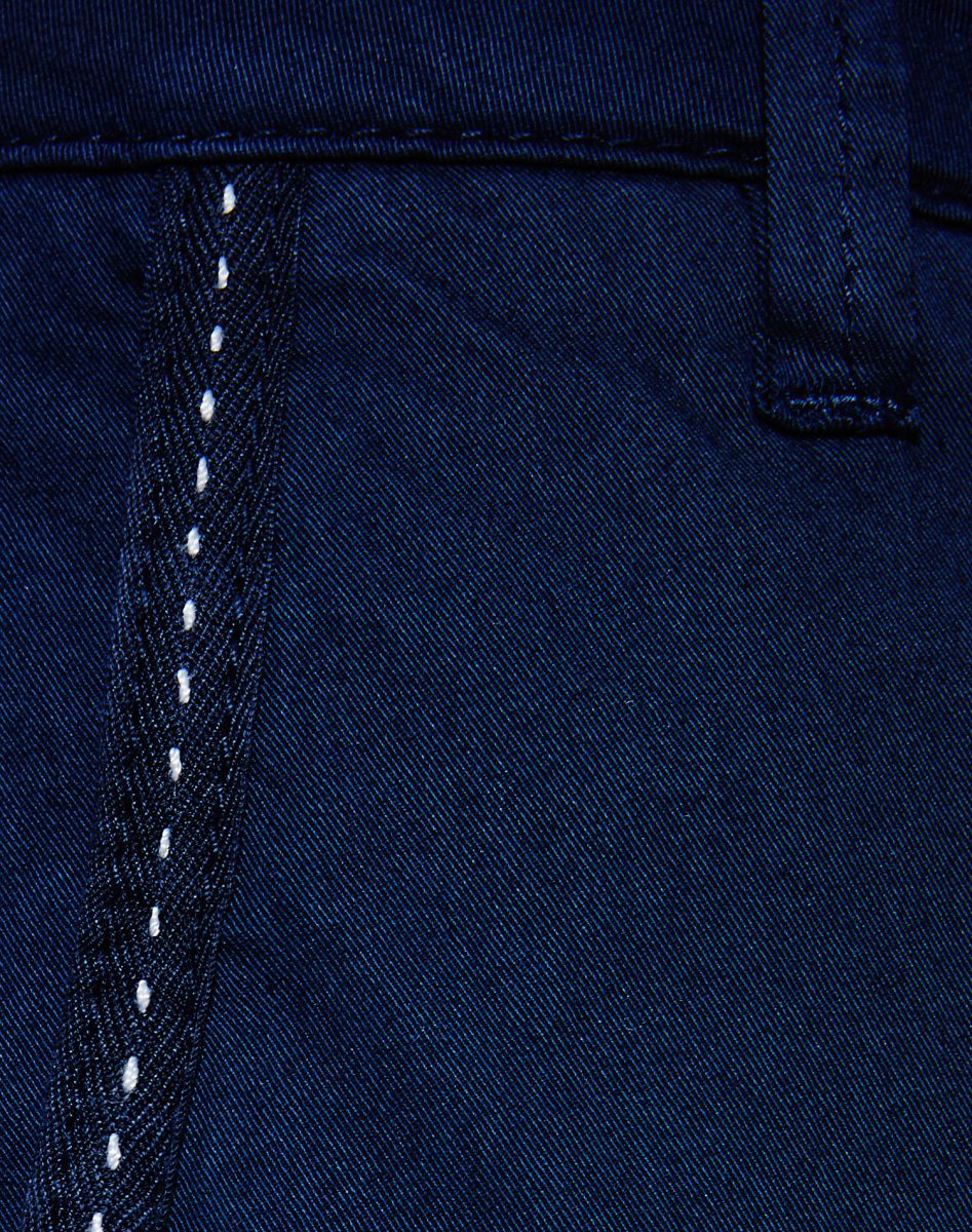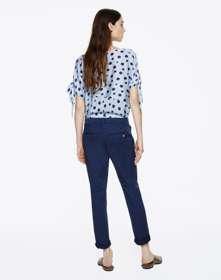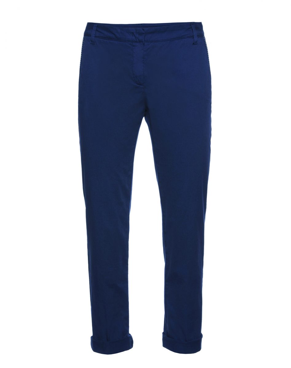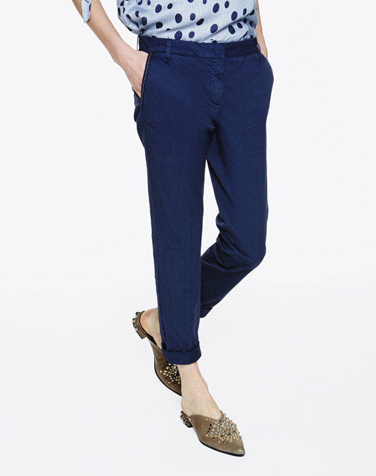Pantalon chino, taille haute. Fermeture éclair et crochet. Ce pantalon se caractérise par un ruban appliqué sur le bord des poches latérales. Le modèle mesure 175 cm et porte une taille 40 italienne.
