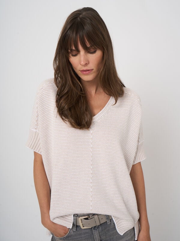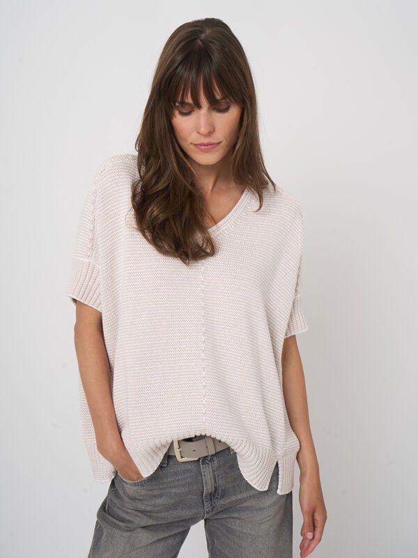 Composé à 100% de coton, le tricot mi-lourd est doux et respirant avec des rayures bicolores et un ourlet côtelé. Silhouette décontractée oversize avec épaules tombantes, manches courtes côtelées et col V, fente à l’avant. Le poncho REPEAT cashmere se superpose aisément sur t-shirts ou chemisiers du bureau au week-end.