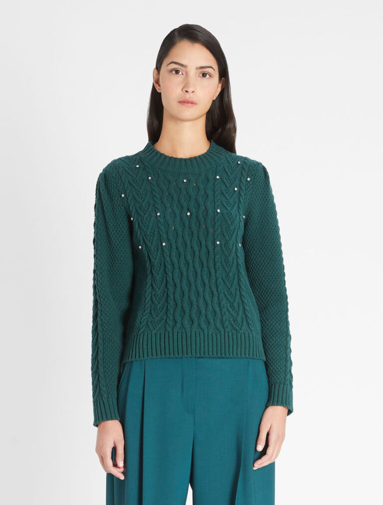 Cotton-blend cordonnet sweater with a round neckline and long sleeves. The garment is embellished with cabochon details. Rib-knit-embellished trims.