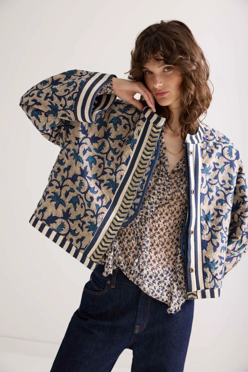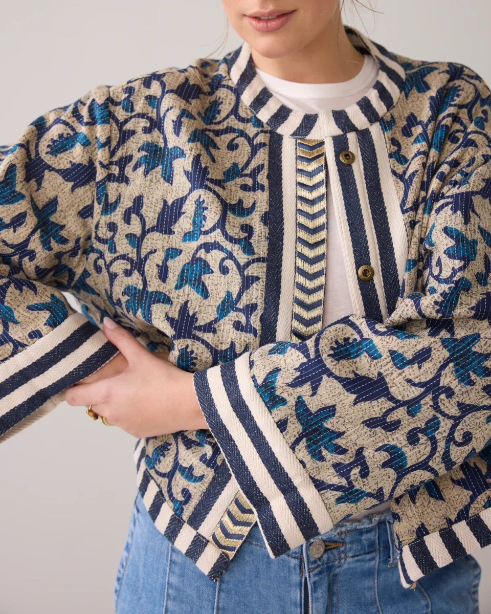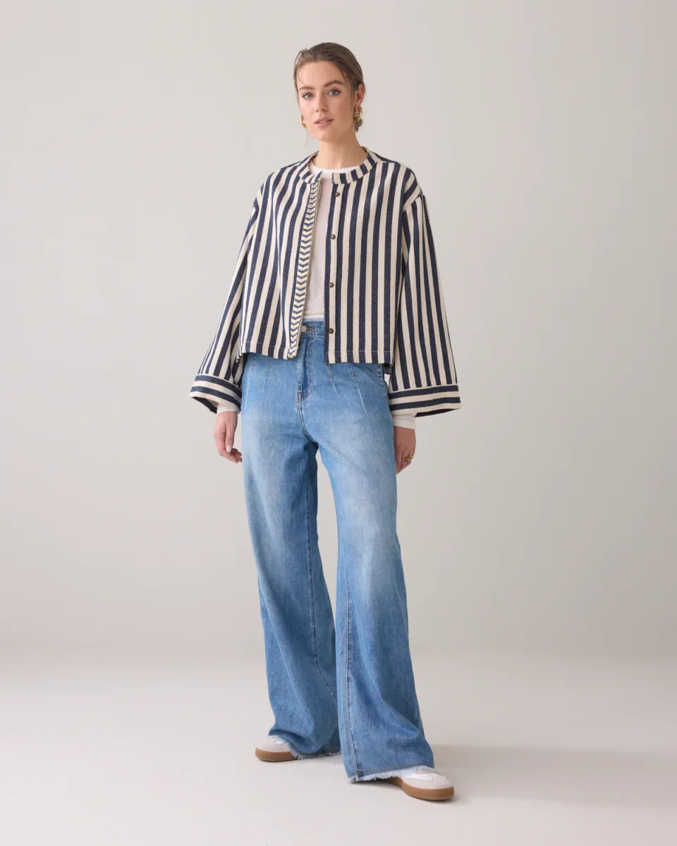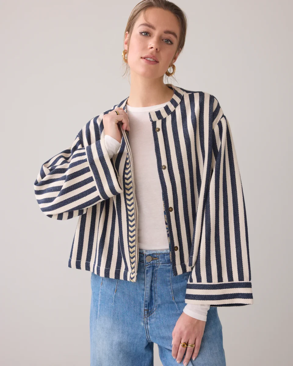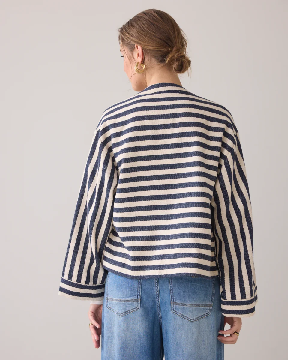 The reversible kimono jacket has a loose fit, long sleeves and a round neckline. The jacket is made of striped jacquard fabric and a block print.