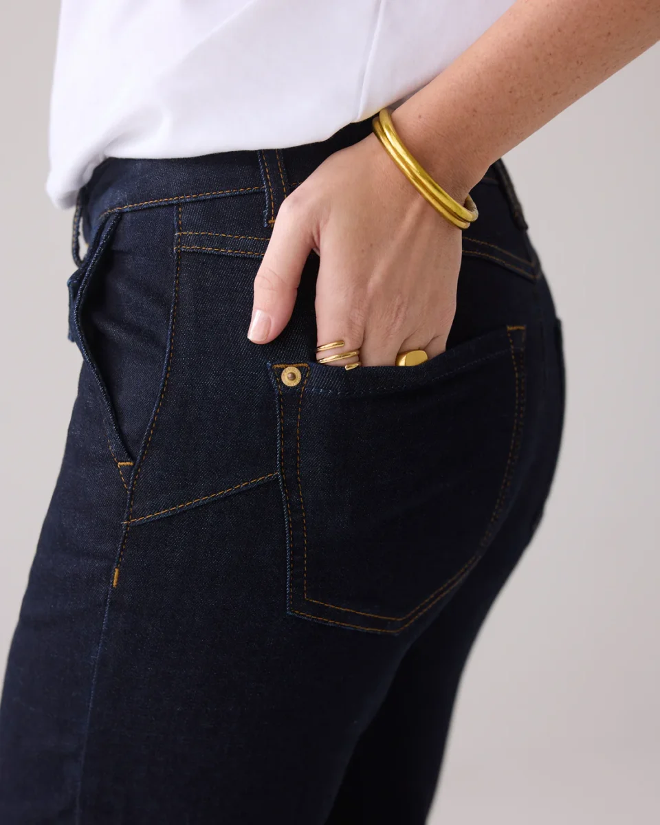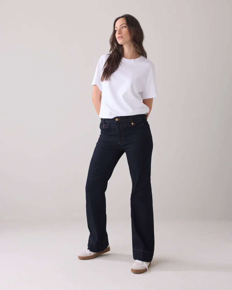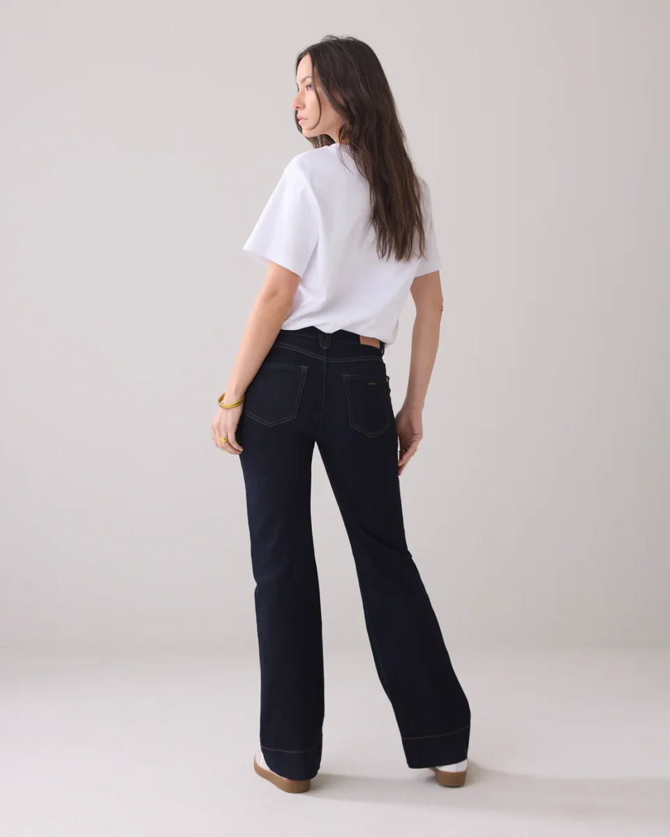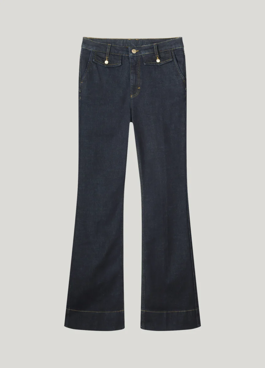 These flared jeans have a mid-rise waist and a slim fit at the hips. The trousers have flared legs and a rinse wash.