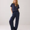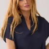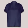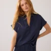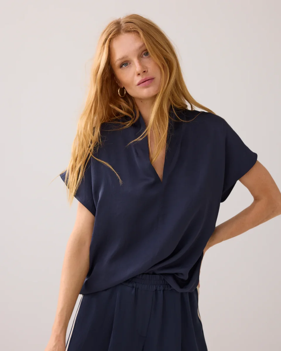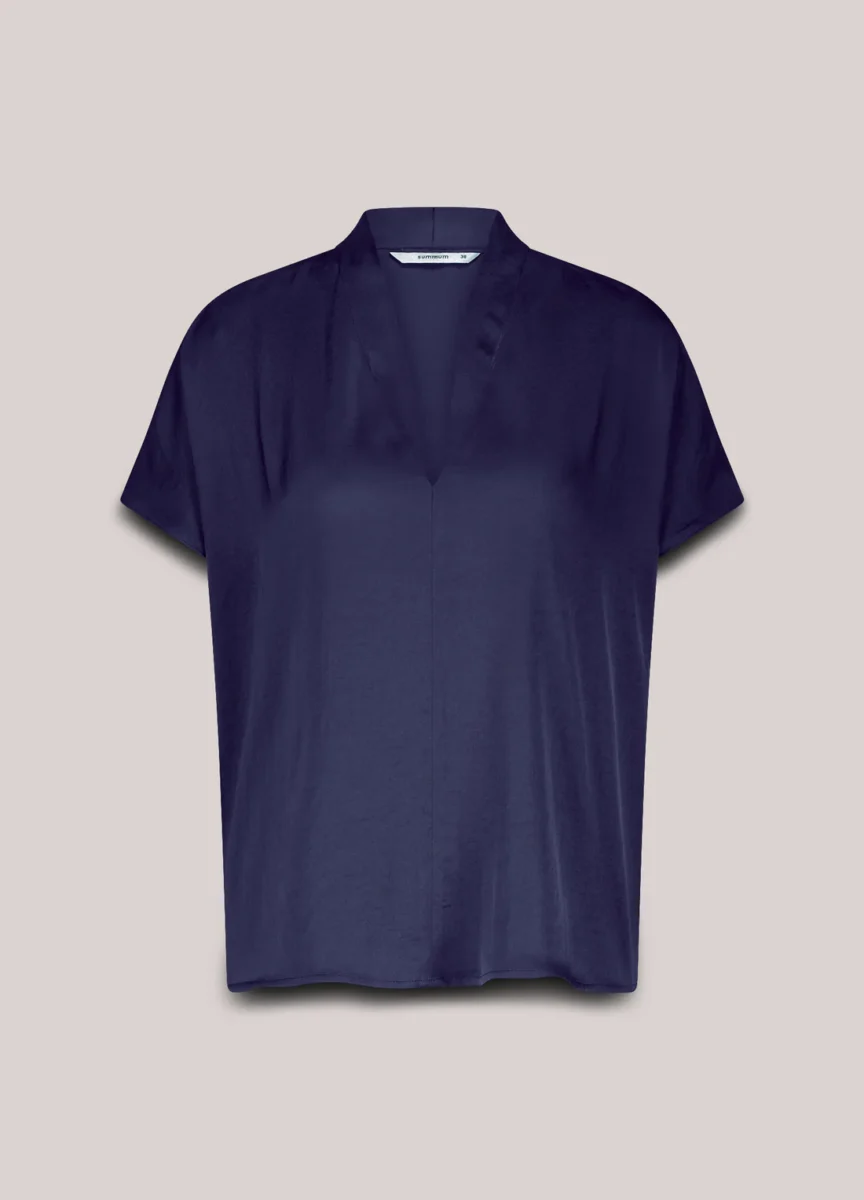 Loose-fitting top with a V-neck and a subtle seam at the centre front. The top has a finely cropped cap sleeve for a flattering effect. • Center back length: ca. 60 cm for size 38.
