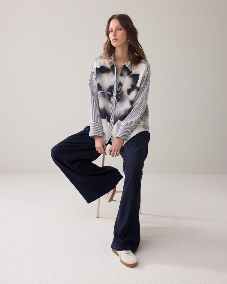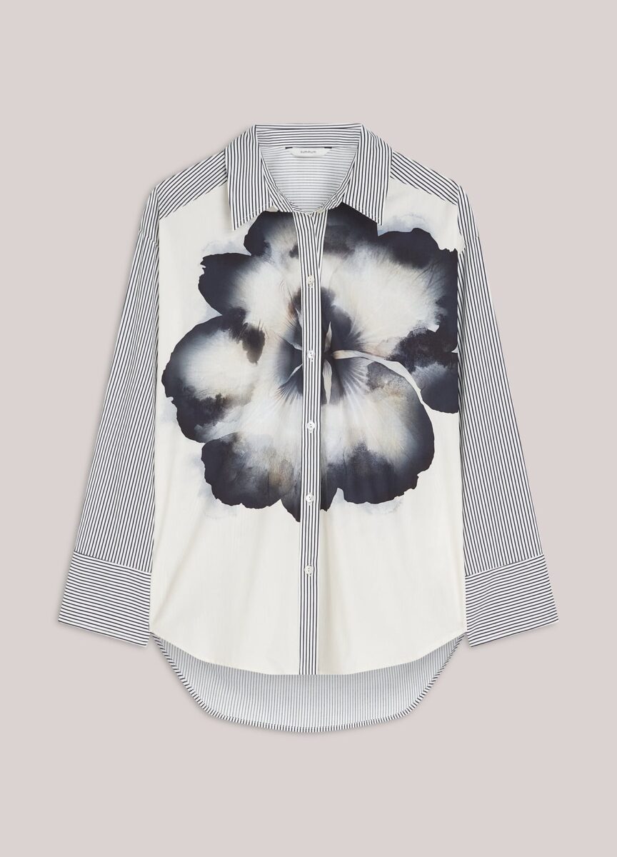 This loose-fitting shirt blouse combines a printed stripe with a unique floral print. The blouse has a lowered shoulder seam and adjustable cuffs.