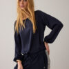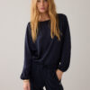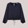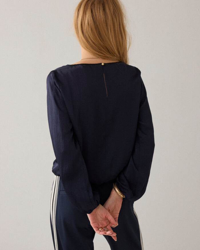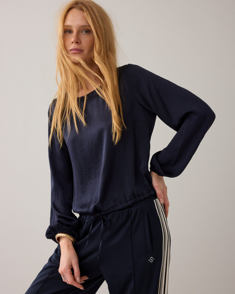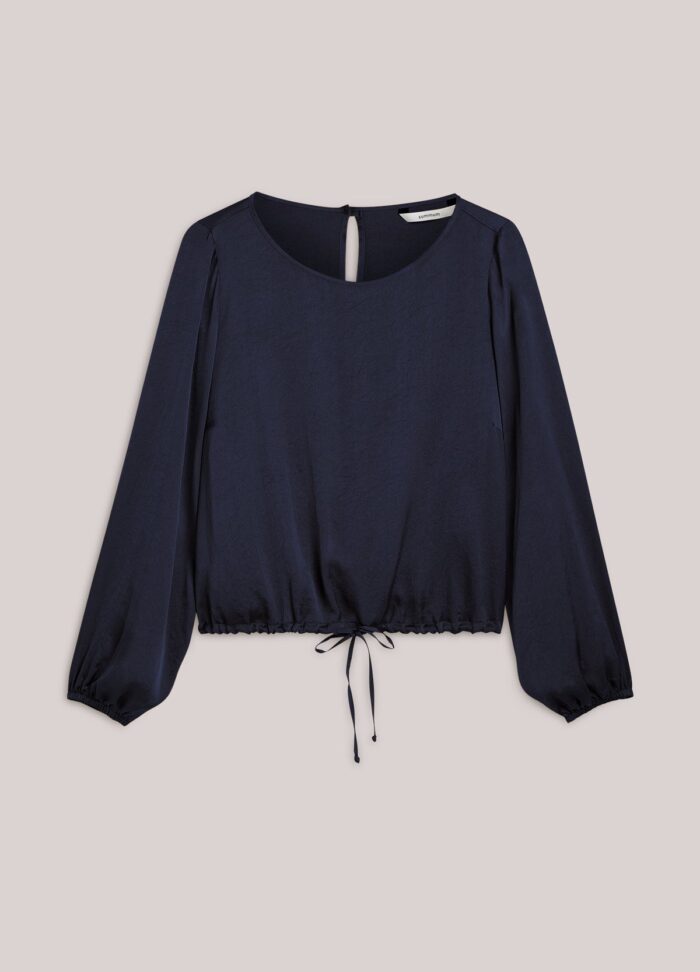 Top in smooth silky touch fabric with a slight sheen. The blouse has a boat neck with slit and gold-tone button on the back, cropped elasticated sleeves and an adjustable hem with fabric drawstring.