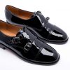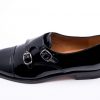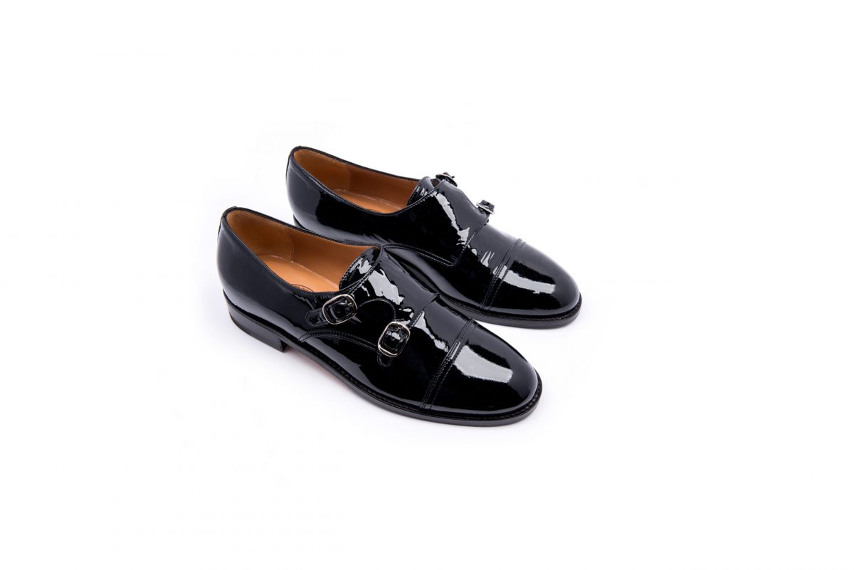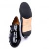 Souliers en cuir vernis noir avec boucles latérales. Semelle en cuir.
