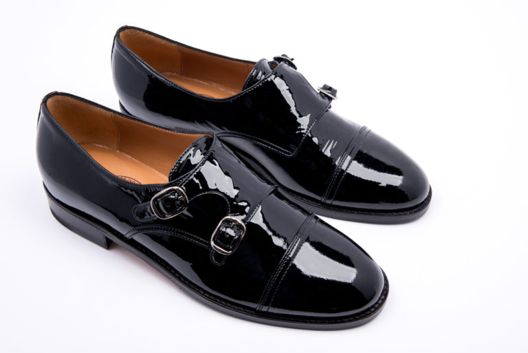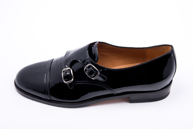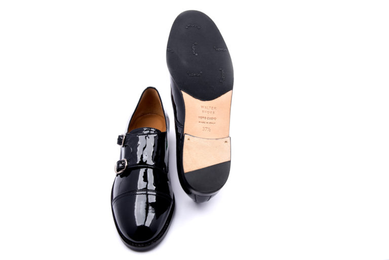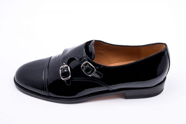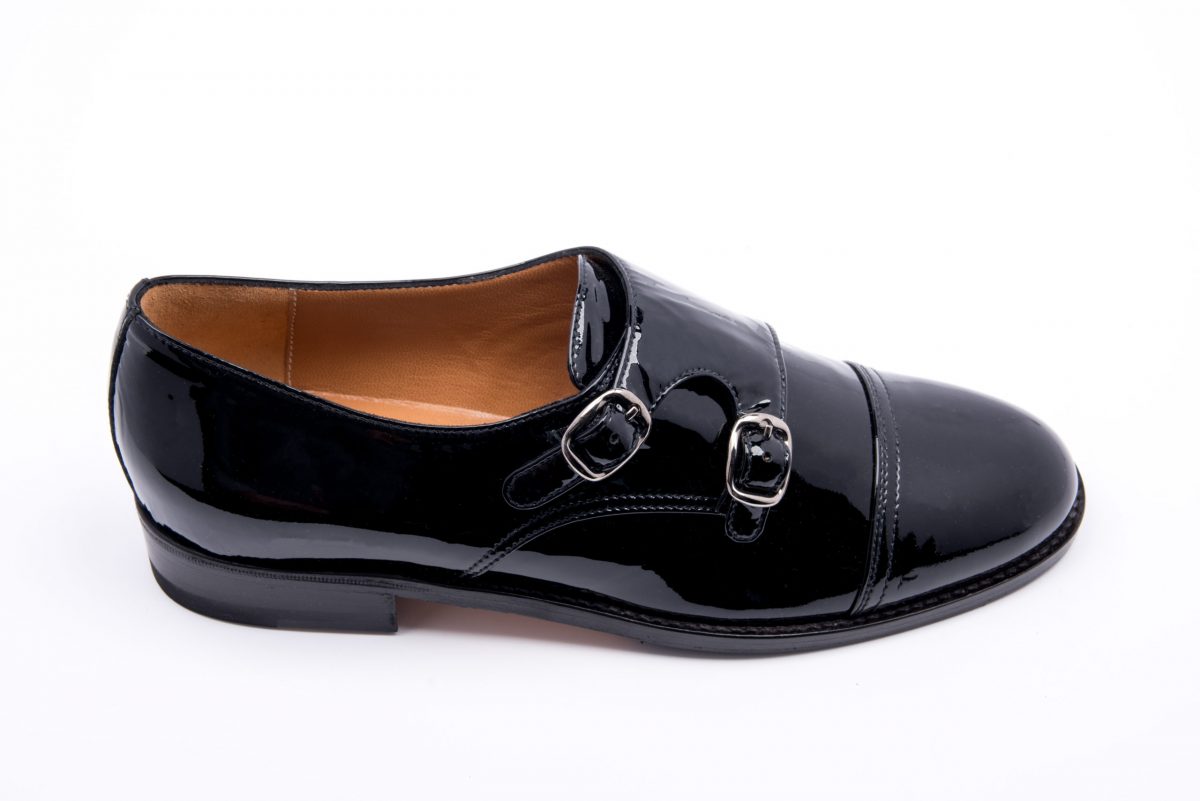 Souliers en cuir vernis noir avec boucles latérales.. Semelle cuir.