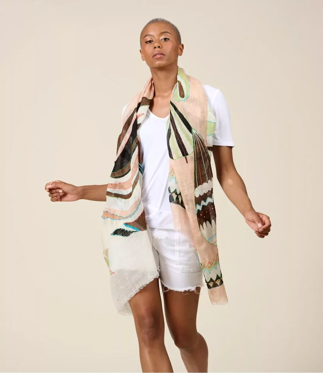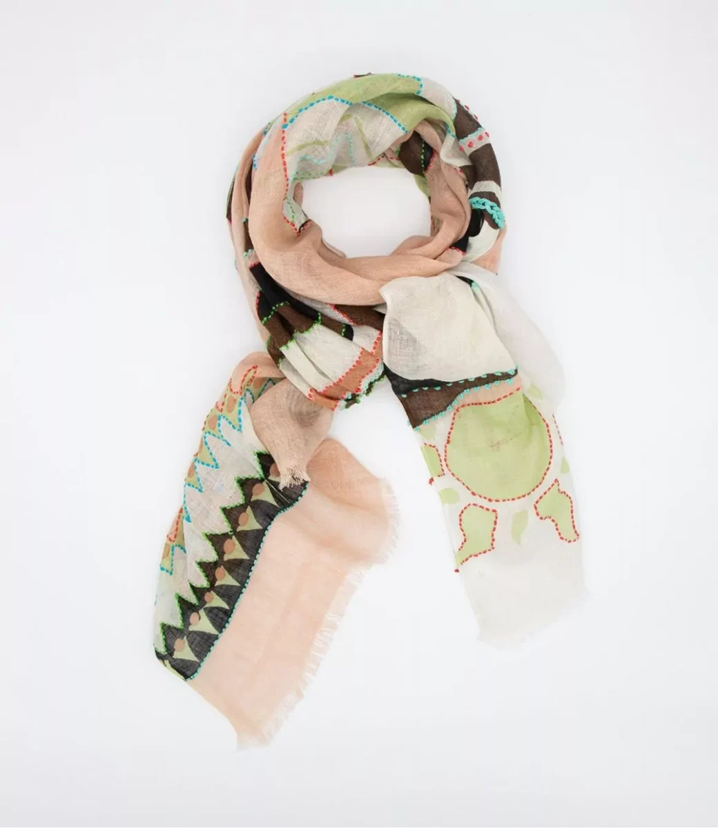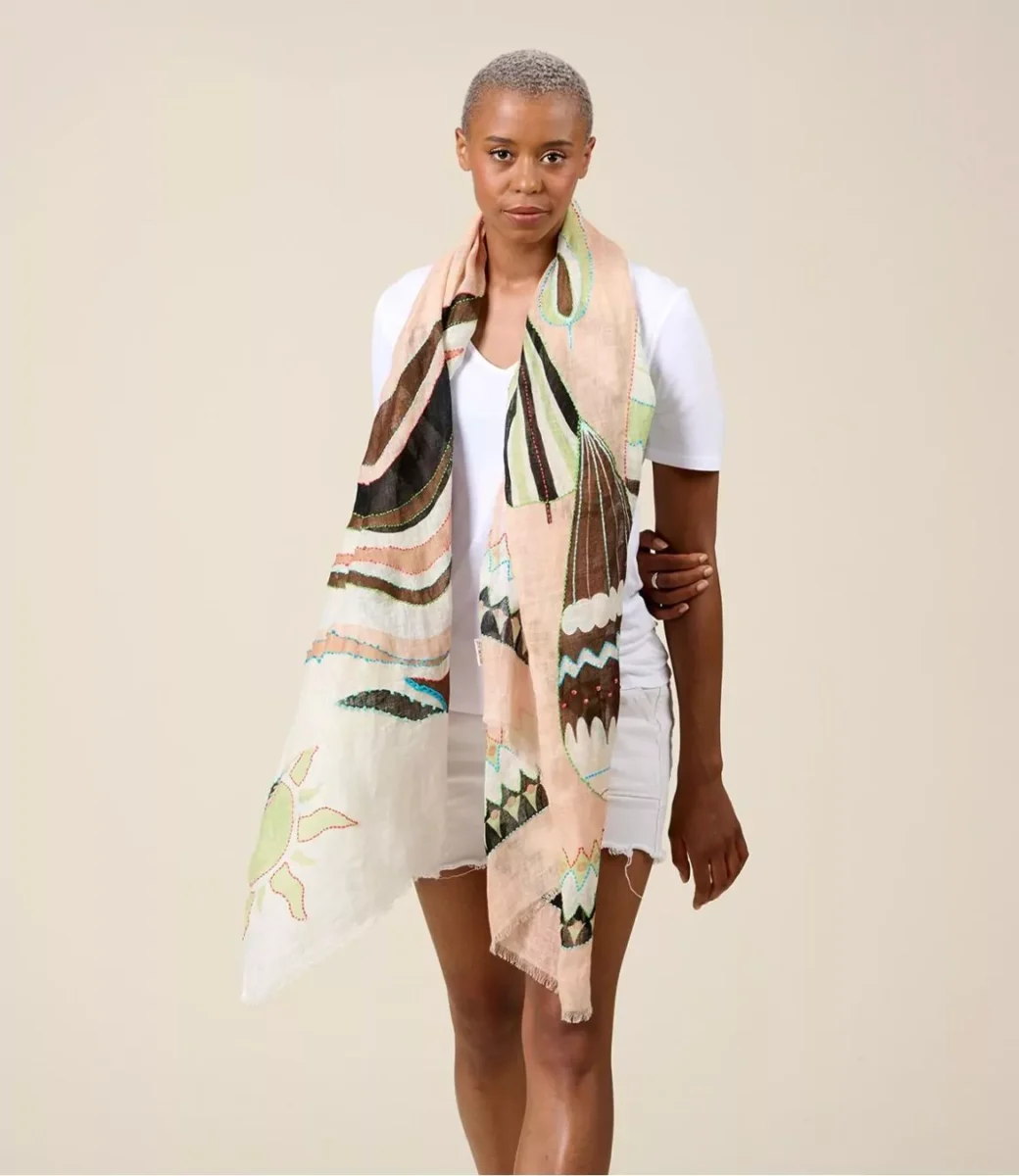 Explorez la sophistication de la référence Avril, façonnée sur une base en lin et enrichie de broderies réalisées à la main. Admirez le dynamisme de son design coloré, fusionnant des motifs de sapins stylisés et de montagnes aux nuances vibrantes. Optez pour l’audace de la couleur en cette saison nouvelle et unique. • Dimensions : 80 x 190 cm • Composition : 100% lin • Broderies faites à la main • Disponible en 5 nuances • Motifs montagnes et sapins • Ce produit a été conçu en respectant les méthodes traditionnelles de teinture et d’impression indiennes. Les variations de couleur et d’impression ne sont pas des défauts, mais plutôt des éléments qui contribuent à la beauté naturelle et à la singularité de chaque écharpe.
