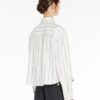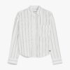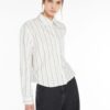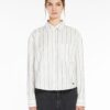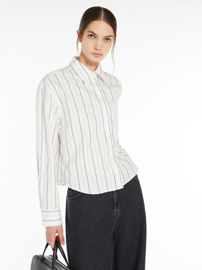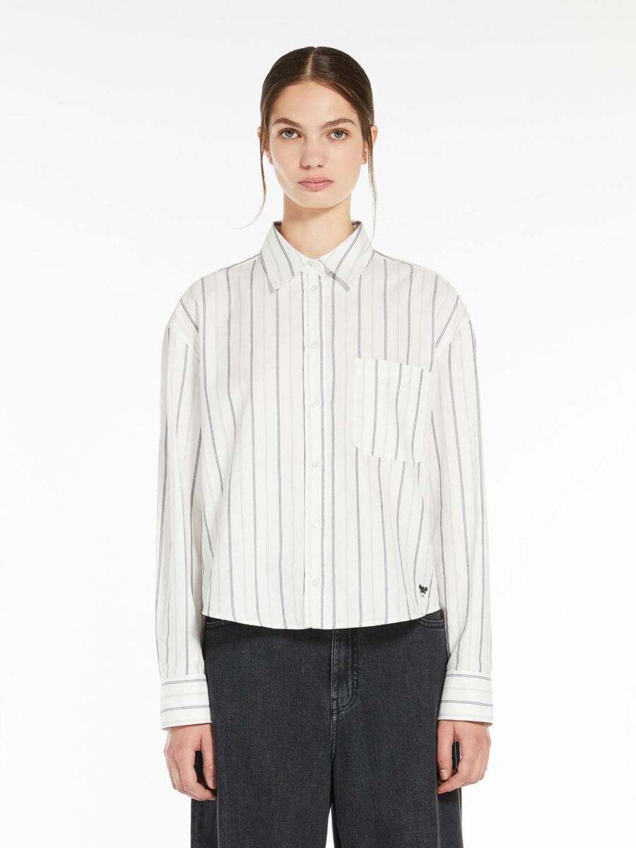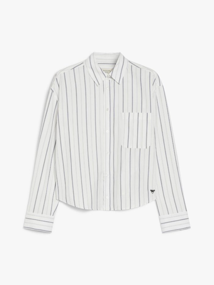 Straight-fit shirt in fine striped cotton Oxford cloth. The classic-style model boasts a mannish collar, patch breast pocket and long cuffed sleeves. Embellished with a darted rear yoke and rounded hem decorated with a small embroidered butterfly logo at the side. Mother-of-pearl button fastening.