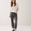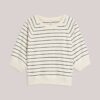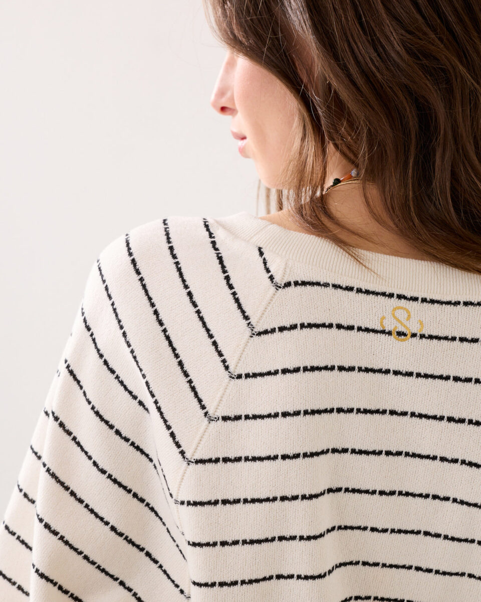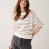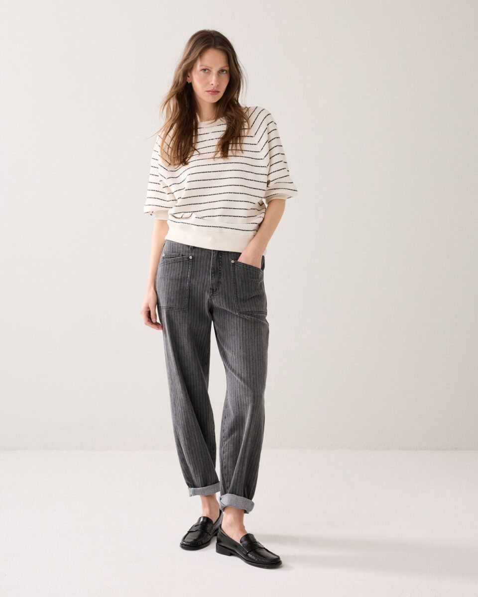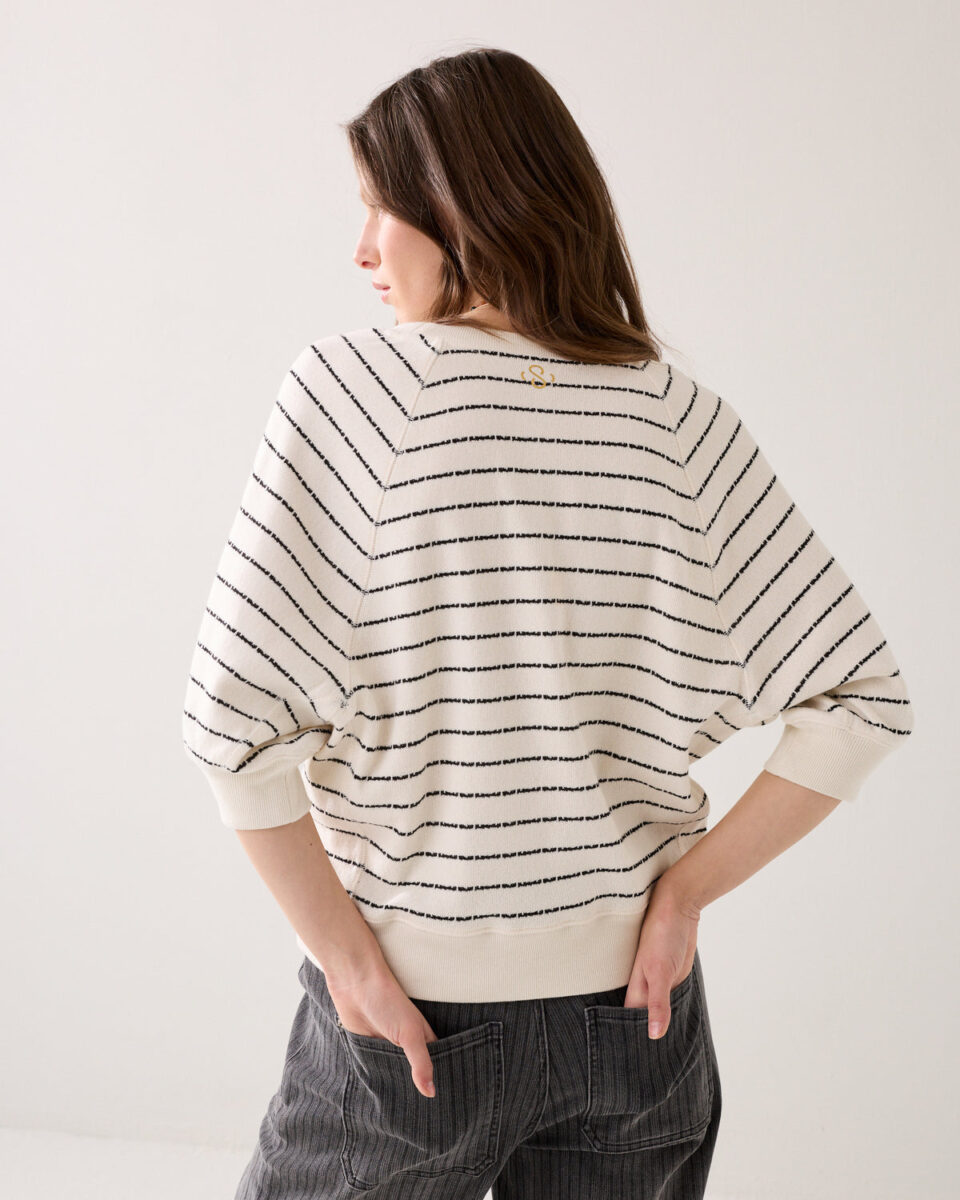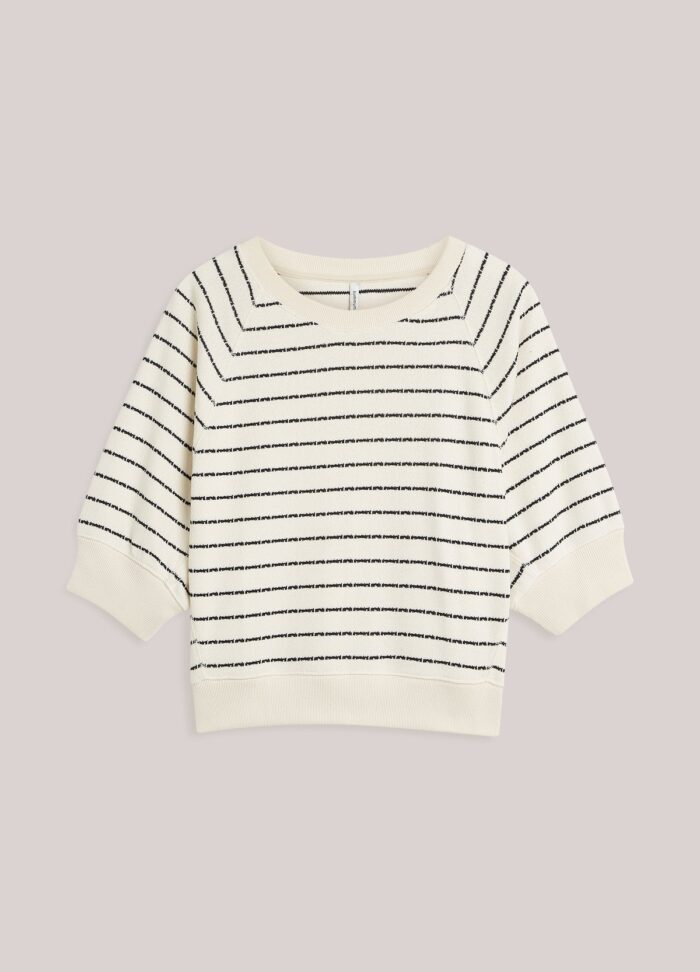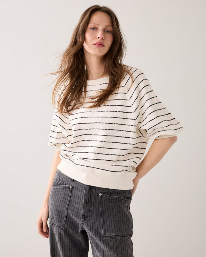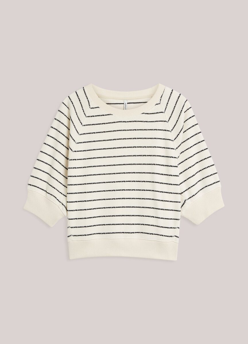 A top made from a luxurious sweatshirt fabric with a woven-in, irregular stripe and a sporty look. The top features a loose, boxy fit with batwing sleeves that fall to the elbow.