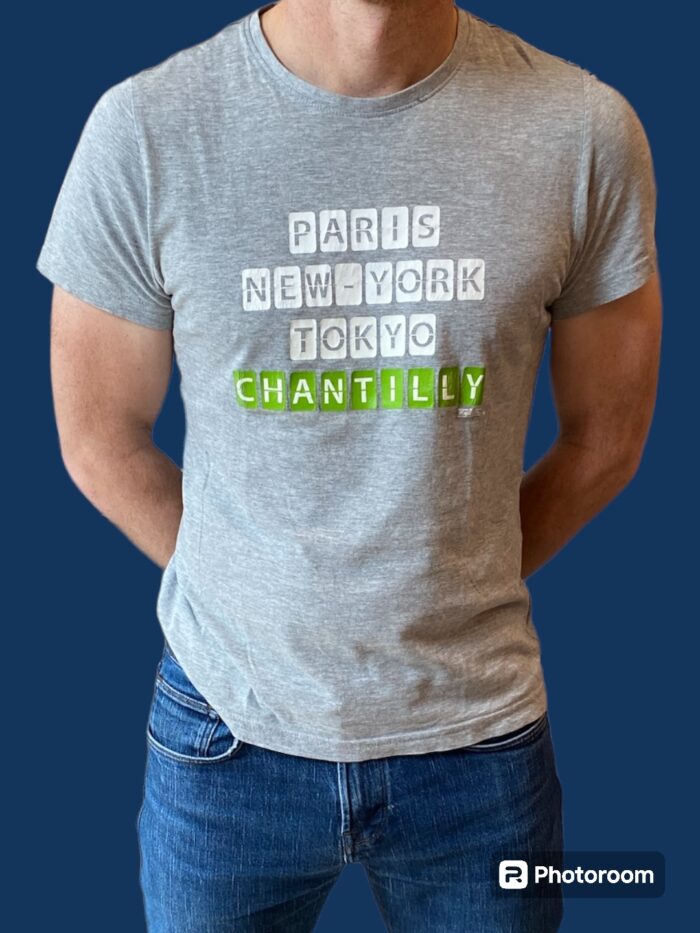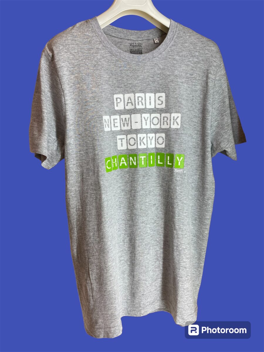 T-shirt en coton biologique. Inscription Paris-NY-Tokyo-Chantilly.