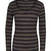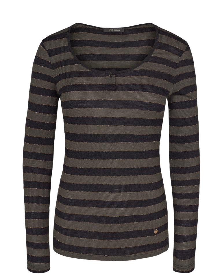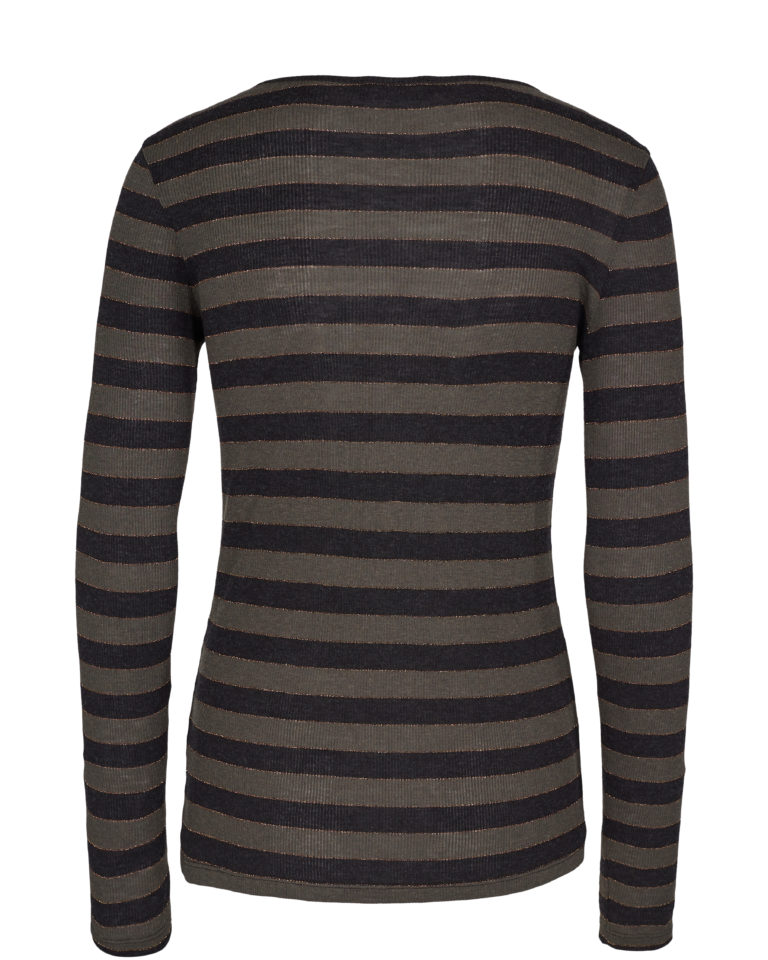 Top rayé noir et kaki avec fines rayures cuivrées. Manches longues, col évasé avec un bouton sur le devant.